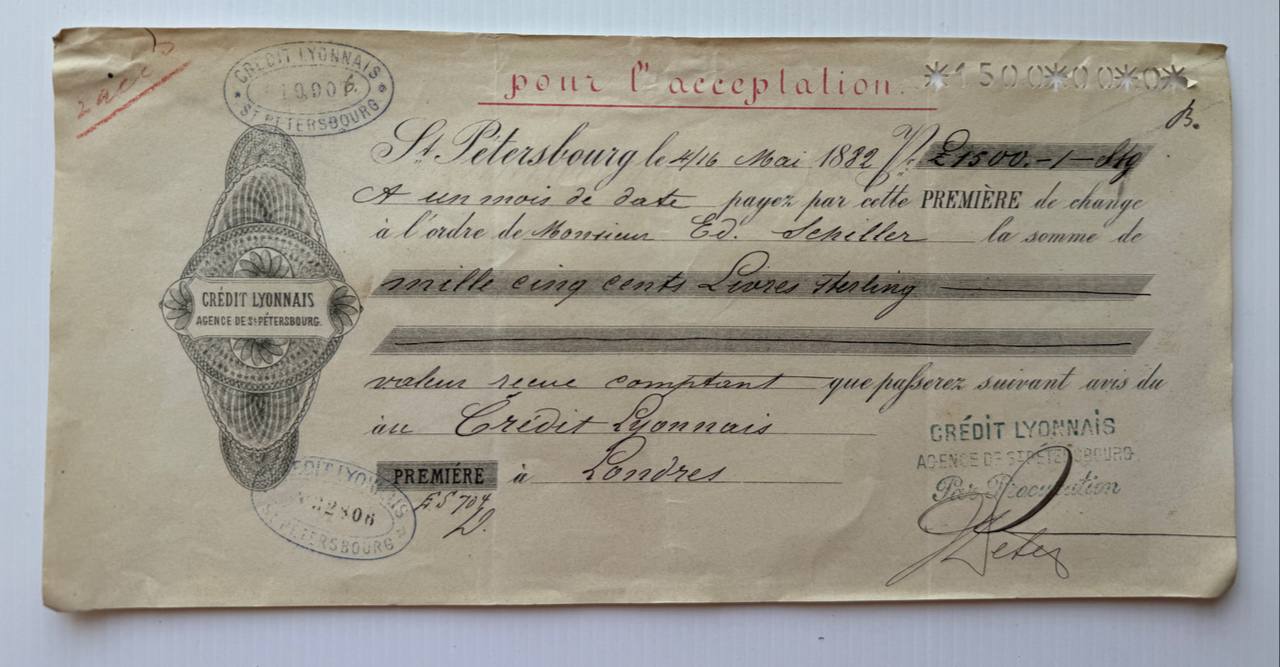 Impressive 1882 financial document (bill of exchange) from Crédit Lyonnais, issued in St. Petersburg for £1500 Sterling. French text, ornate design, preprinted forms, and stamps. French banking influence in Tsarist Russia is prominently displayed.