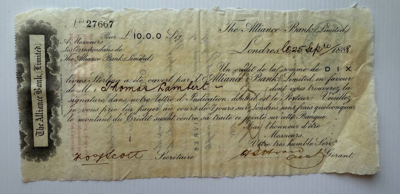 The Alliance Bank (London) issued credit letter from 1888 for £10 to Thomas Lambert. Beautiful script, signed by bank officials. Shows structure of Victorian-era personal and commercial credit networks.