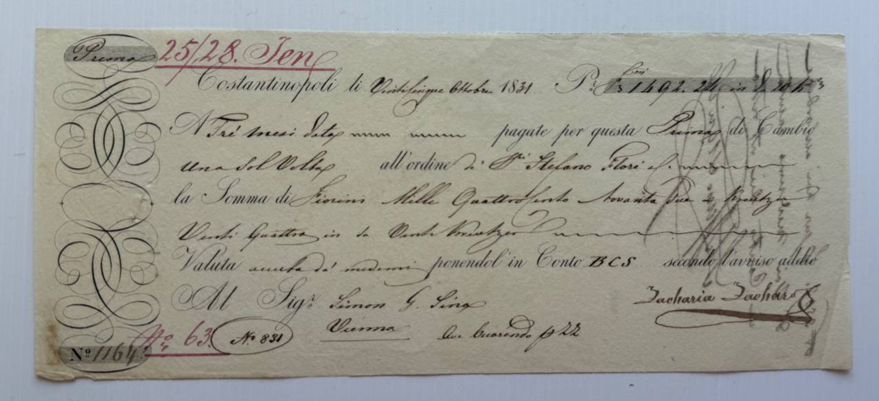 Very rare and ornate Ottoman draft written in Italian and payable in Vienna. Issued by Zacharia Zachariah in Constantinople. Featuring beautiful calligraphy and red script, it represents early European-Ottoman trade relations.