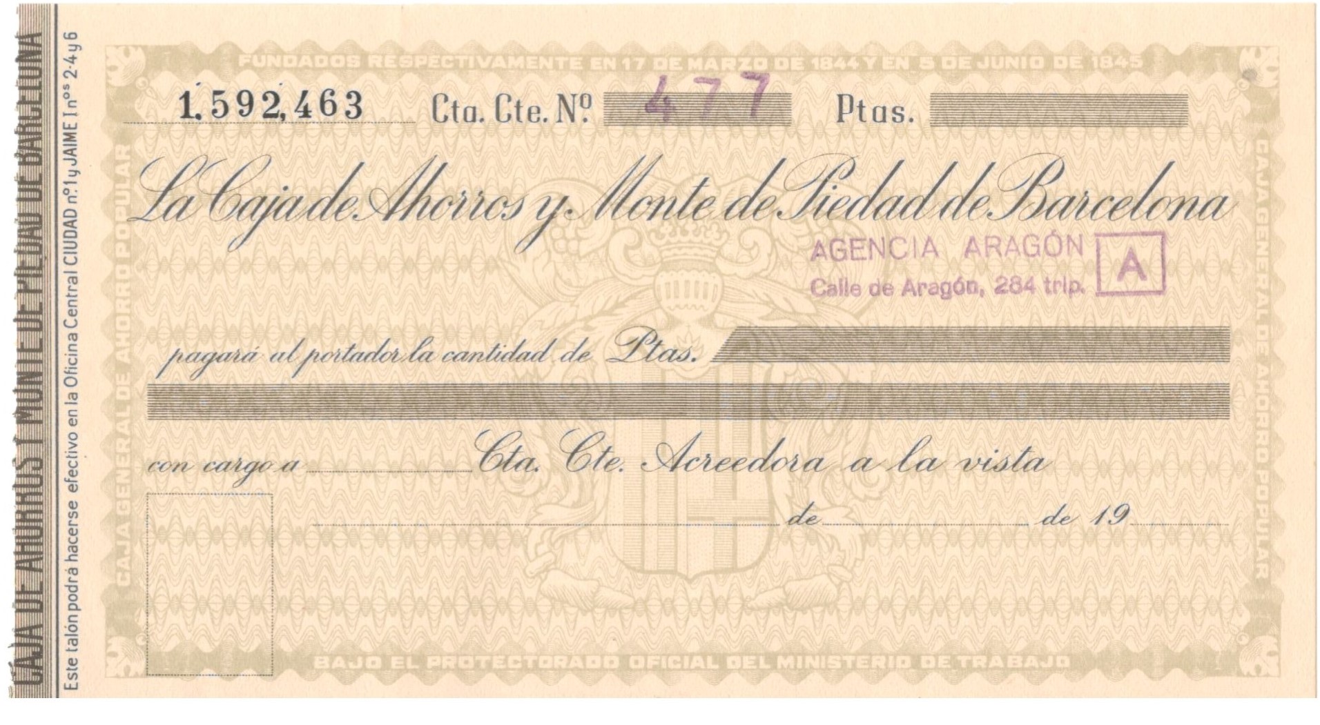 Unused cheque from La Caja de Ahorros y Monte de Piedad de Barcelona (Caixa). Beautiful art-deco border and typography representing Spanish mid-century banking design. Ideal for collectors of Spanish banking ephemera.