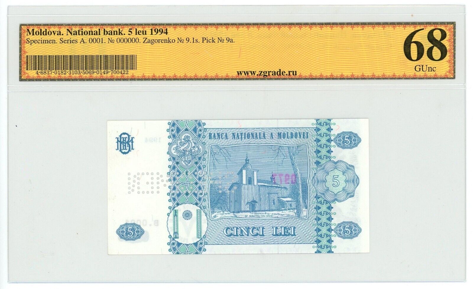 Specimen 5 Lei banknote issued by the National Bank of Moldova in 1994. Portrait of Stefan cel Mare, specimen serial B.0001 with number 000000. Pick #9a, Numista #MOL102. A pristine collector’s item.