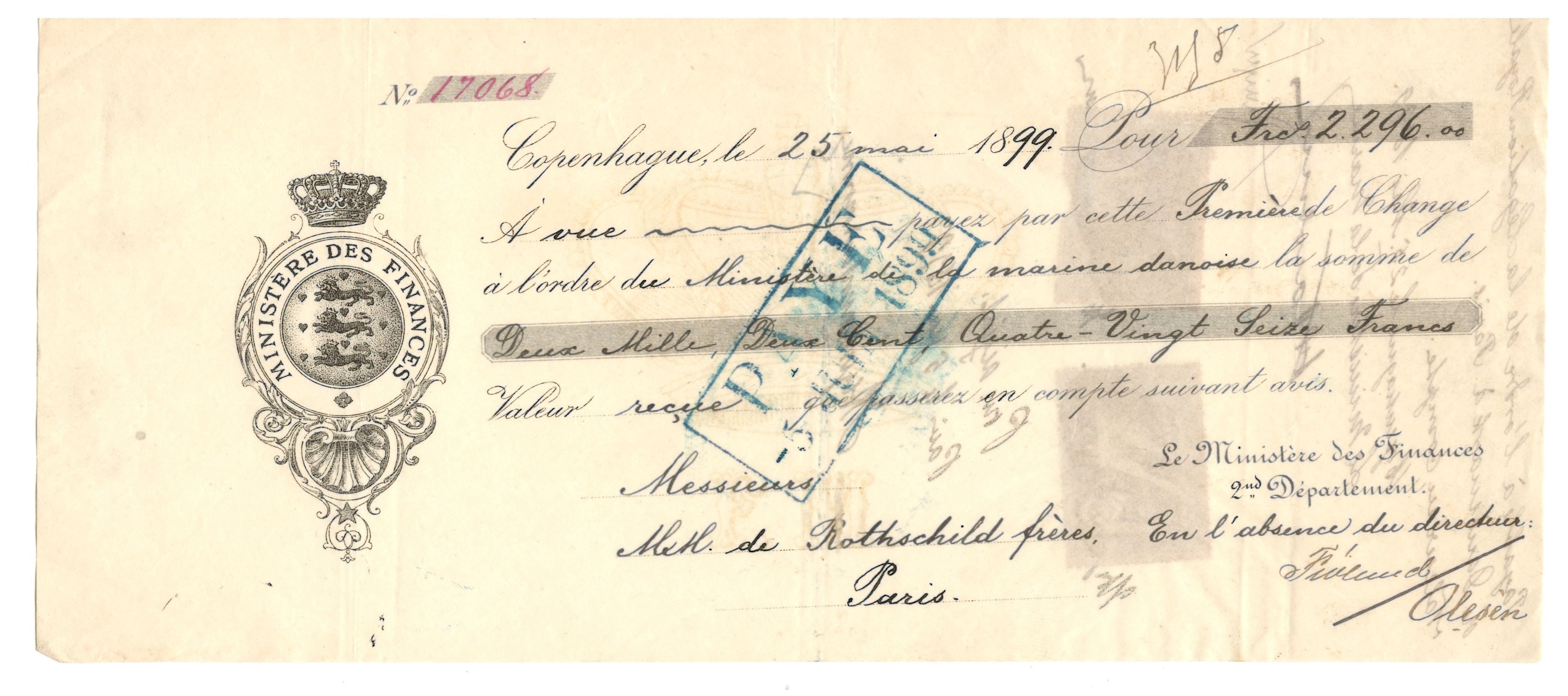 Beautifully preserved official bill of exchange issued in Copenhagen on 25 May 1899 by the Danish Ministry of Finance, Second Department (Ministère des Finances, 2me Département), for the amount of 2,296.05 francs. The payment is directed to Messieurs Rothschild Frères in Paris and is issued on behalf of the Ministry of the Danish Navy (Ministère de la Marine Danoise).