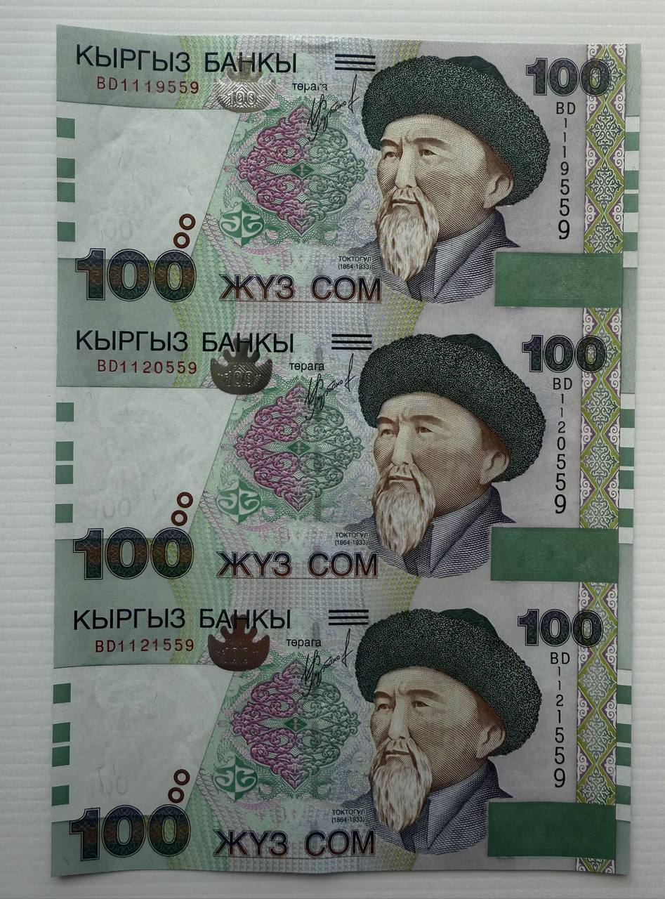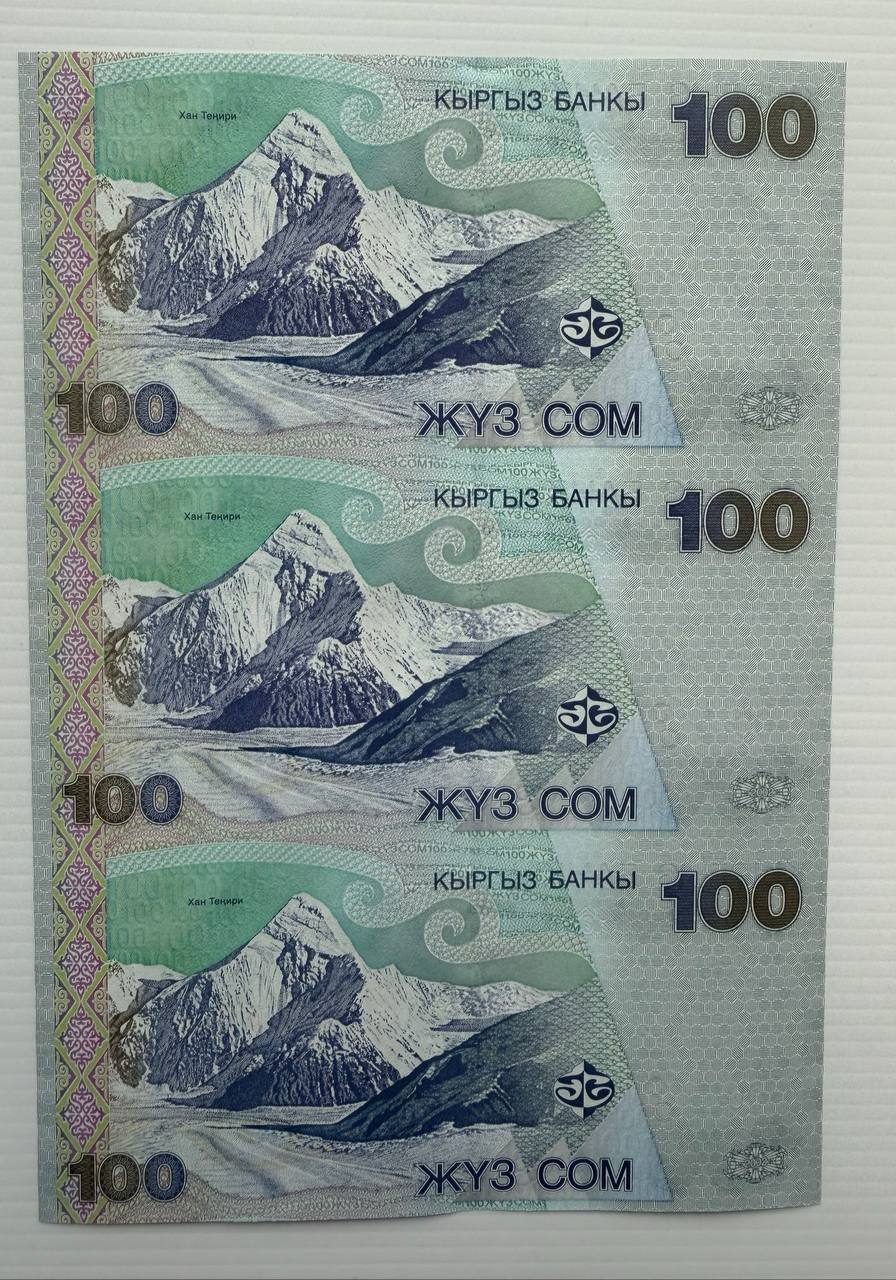 Three 100 Som notes in uncut format featuring Toktogul Satylganov. Consecutive serials and clear security features make this an exceptional modern numismatic item for currency collectors.