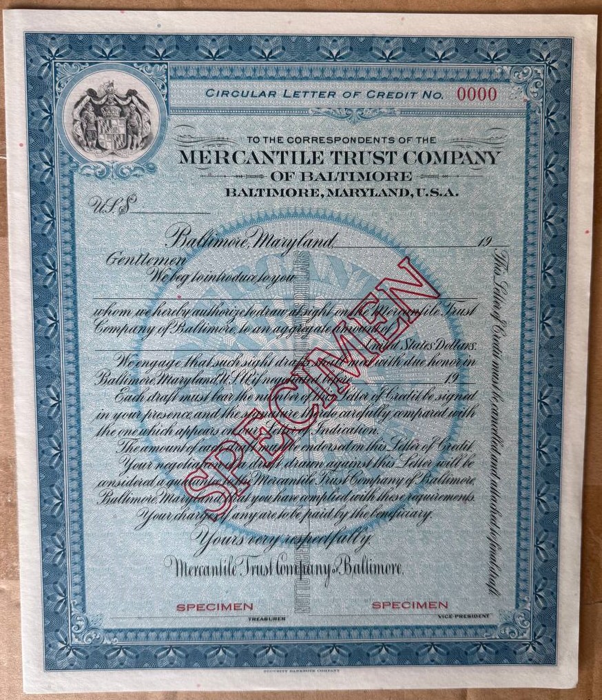 Decorative specimen circular letter of credit from the Mercantile Trust Company of Baltimore, Maryland. Elegant design and excellent preservation. Not mentioned in Ilkka Mäkitie’s reference work, adding to its appeal for collectors.