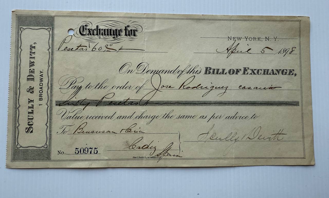 Bill of exchange issued by Scully & Dewitt, Broadway, New York, dated April 5, 1898, payable to José Rodriguez in Cadiz, Spain. Small denomination and international transaction before the Spanish-American War. Theme: US-Spain trade finance.