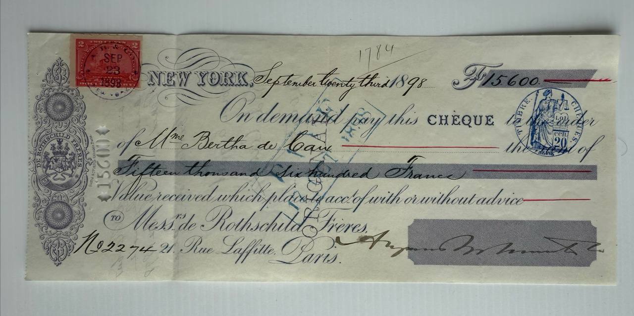 Large-value cheque issued in New York to Rothschild Frères, Paris, for Mme Bertha de Caen. Features ornate border and bilingual financial notations. A prime example of high-value international money transfer at the end of the 19th century. hand-signed by August Belmont Jr, a prominent American banker.