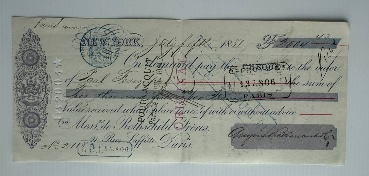Cheque issued to Paul Georges from New York to Rothschild Frères, Paris. Date stamped multiple times with banking and customs notations. Hand-signed by August Belmont Sr. Collectors of financial history and transatlantic trade will appreciate this.