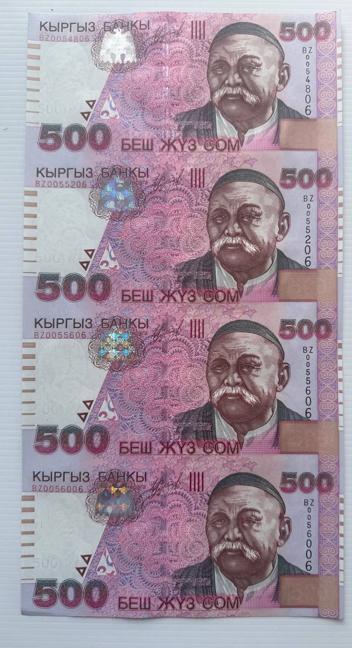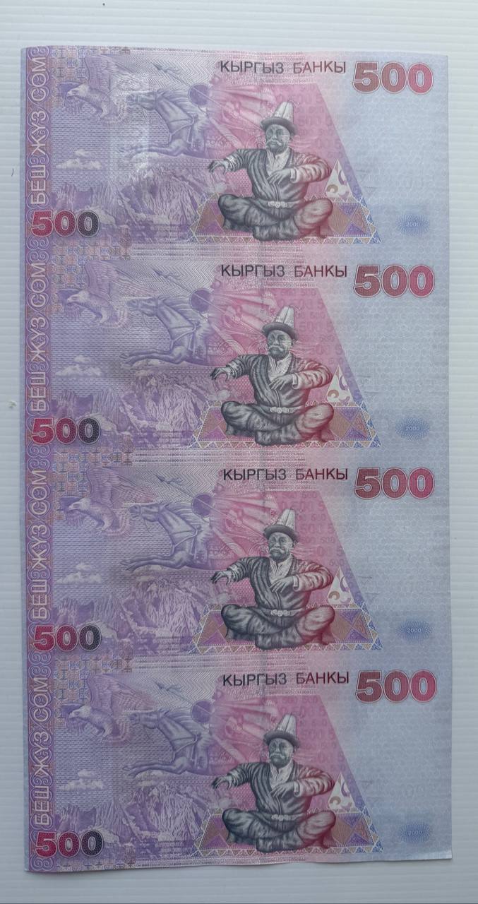 Spectacular uncut sheet of four 500 Som notes with portrait of Kurmanjan Datka. Contains original holograms and perfect centering. Excellent for presentation or museum-grade collection.