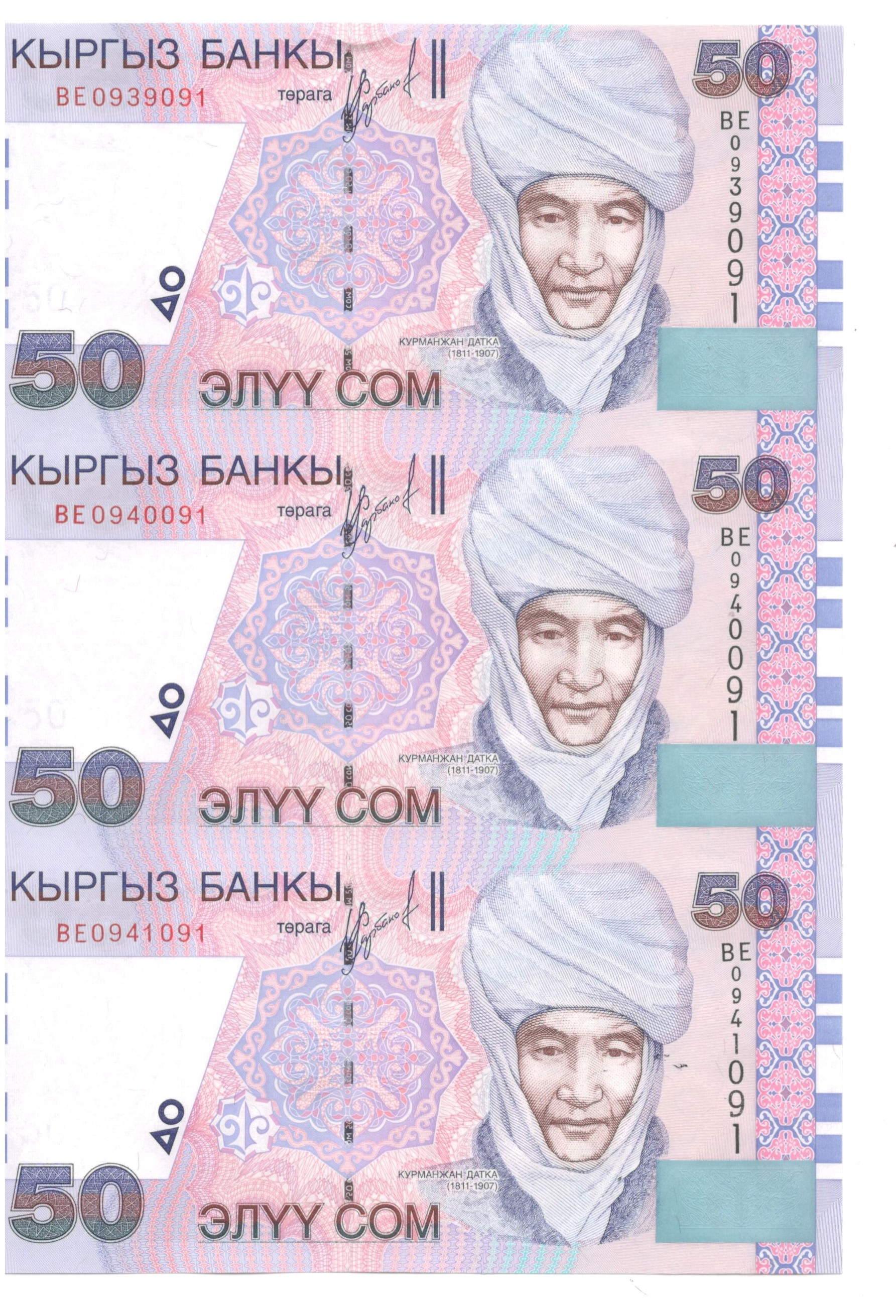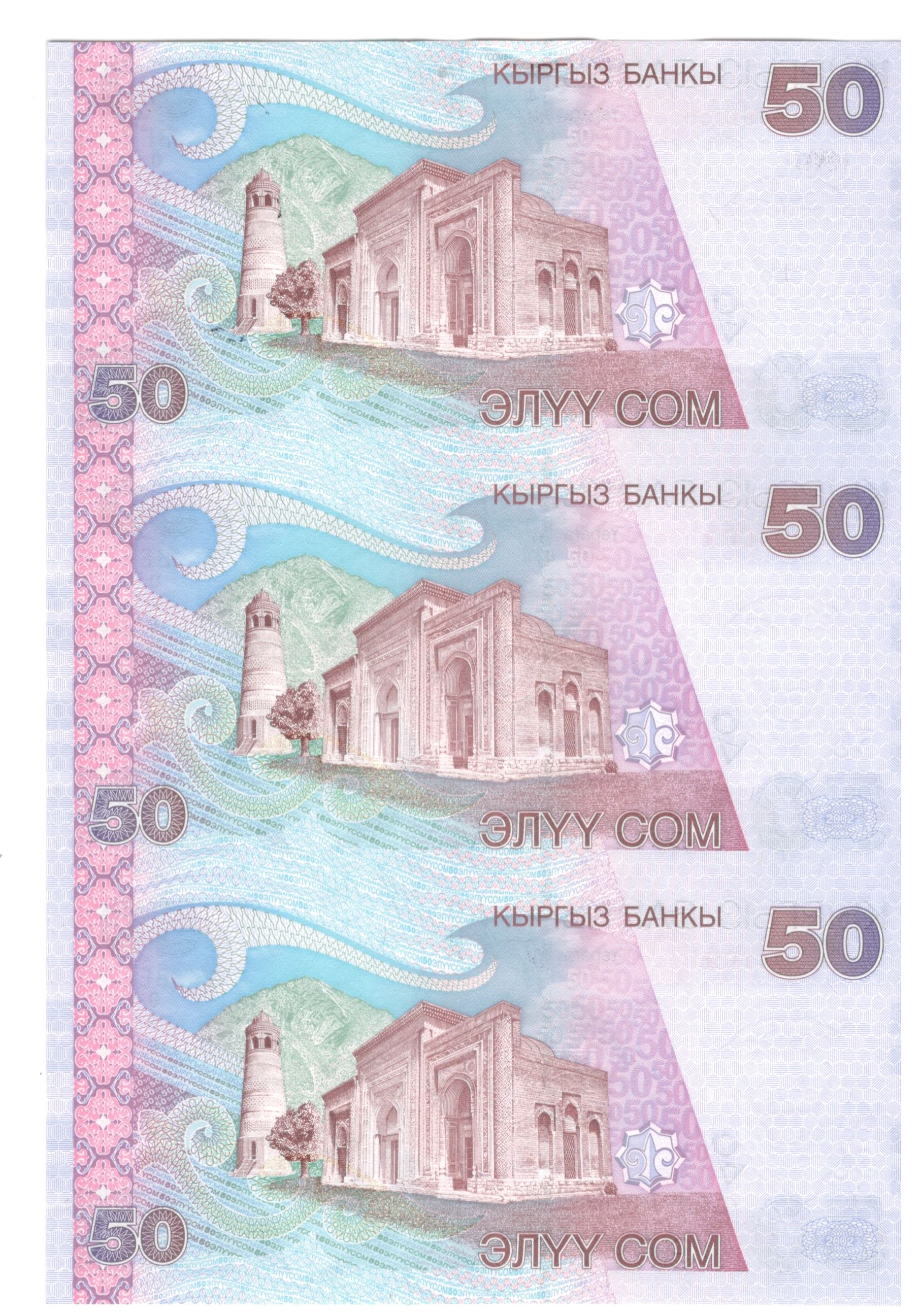 Uncut vertical sheet featuring three 50 Som notes, each showing the Burana Tower and architectural motifs. A rare collector item from Kyrgyzstan’s early 21st-century currency printing. Highlights regional culture and numismatic design.
