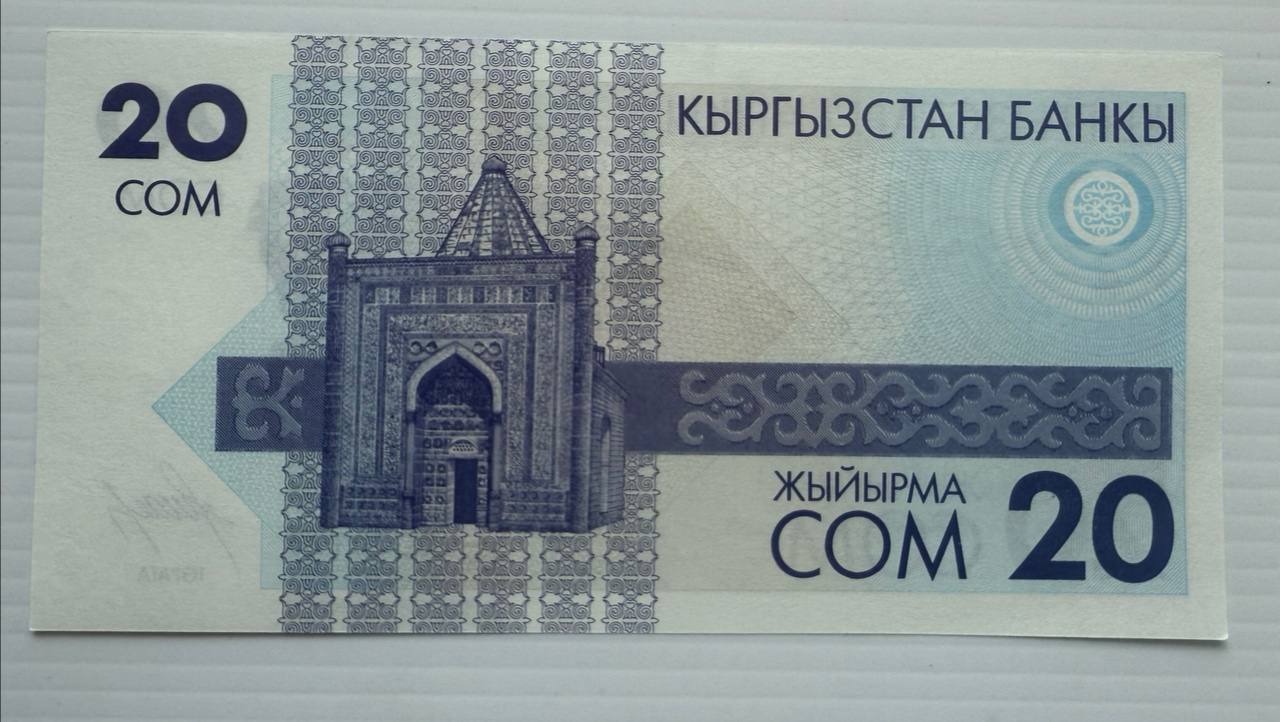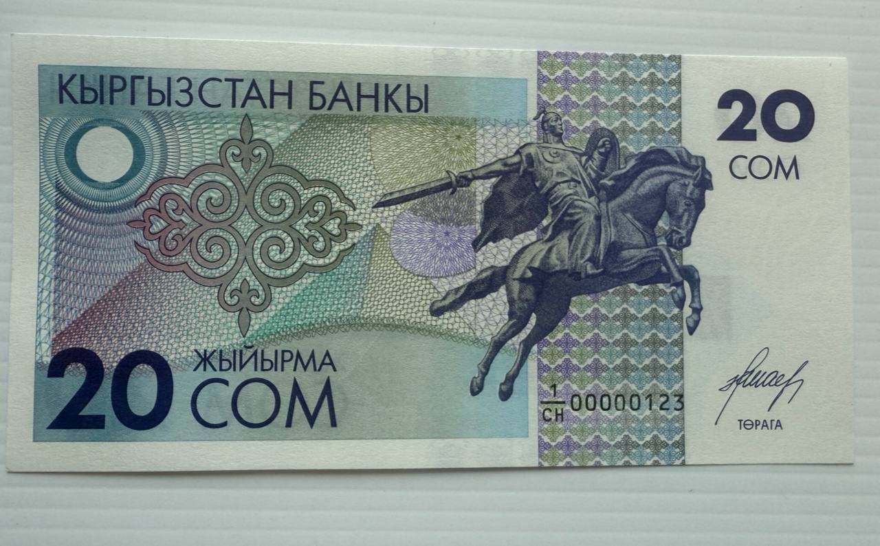 Rare low-serial 20 Som note from Kyrgyzstan featuring the epic hero Manas. The vivid blue design, mounted warrior, and early serial (00000123) enhance the rarity and visual appeal for modern collectors.