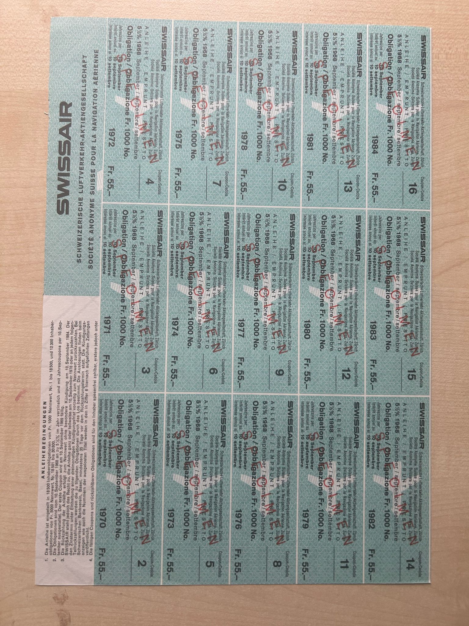 Specimen bond certificate from Swissair, the Swiss national airline, featuring multilingual text (German, French, Italian). A striking aviation-themed document ideal for collectors of airline ephemera or modern European financial paper.