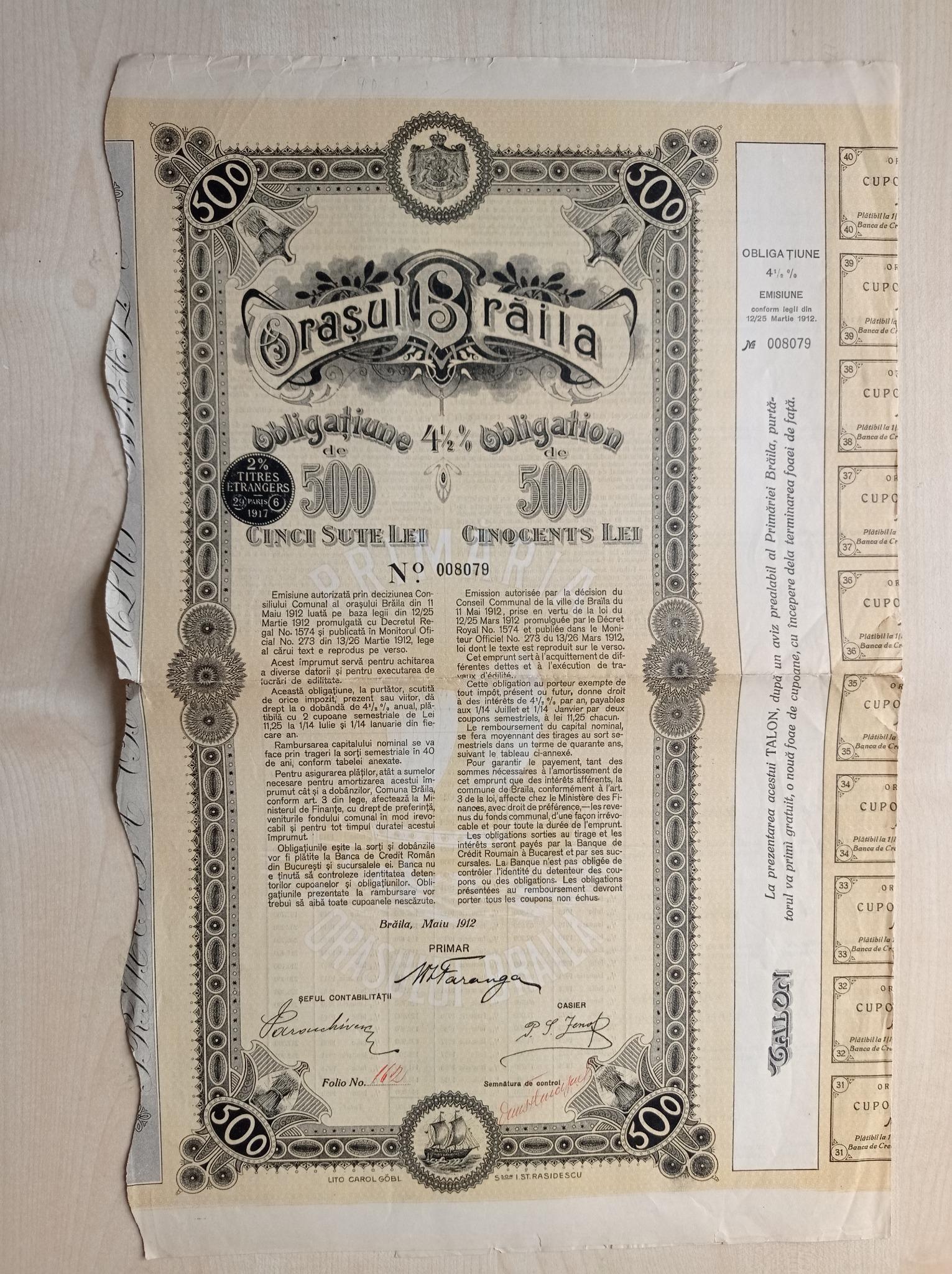 Romania, City of Brăila, Municipal Bond, Brăila, 1912, 500 Lei