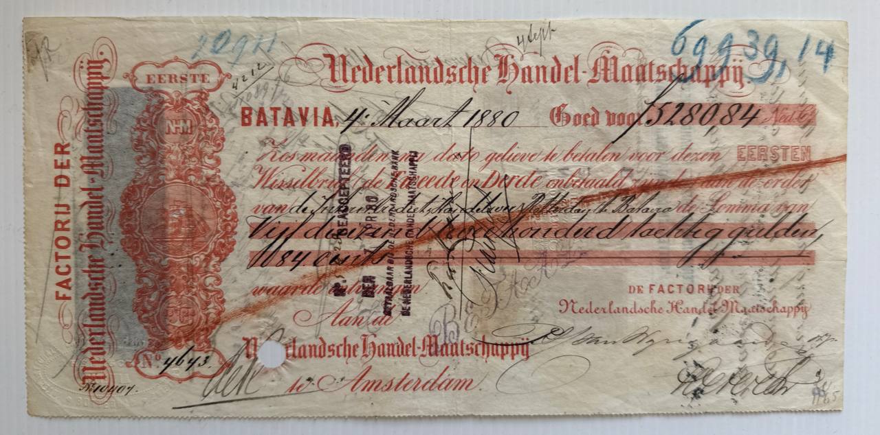 Attractive colonial-era bill of exchange issued in Batavia (now Jakarta), dated 4 March 1880. Issued by the Nederlandsche Handel-Maatschappij (NHM), a major trading company. A fine example of Dutch East Indies financial documentation.