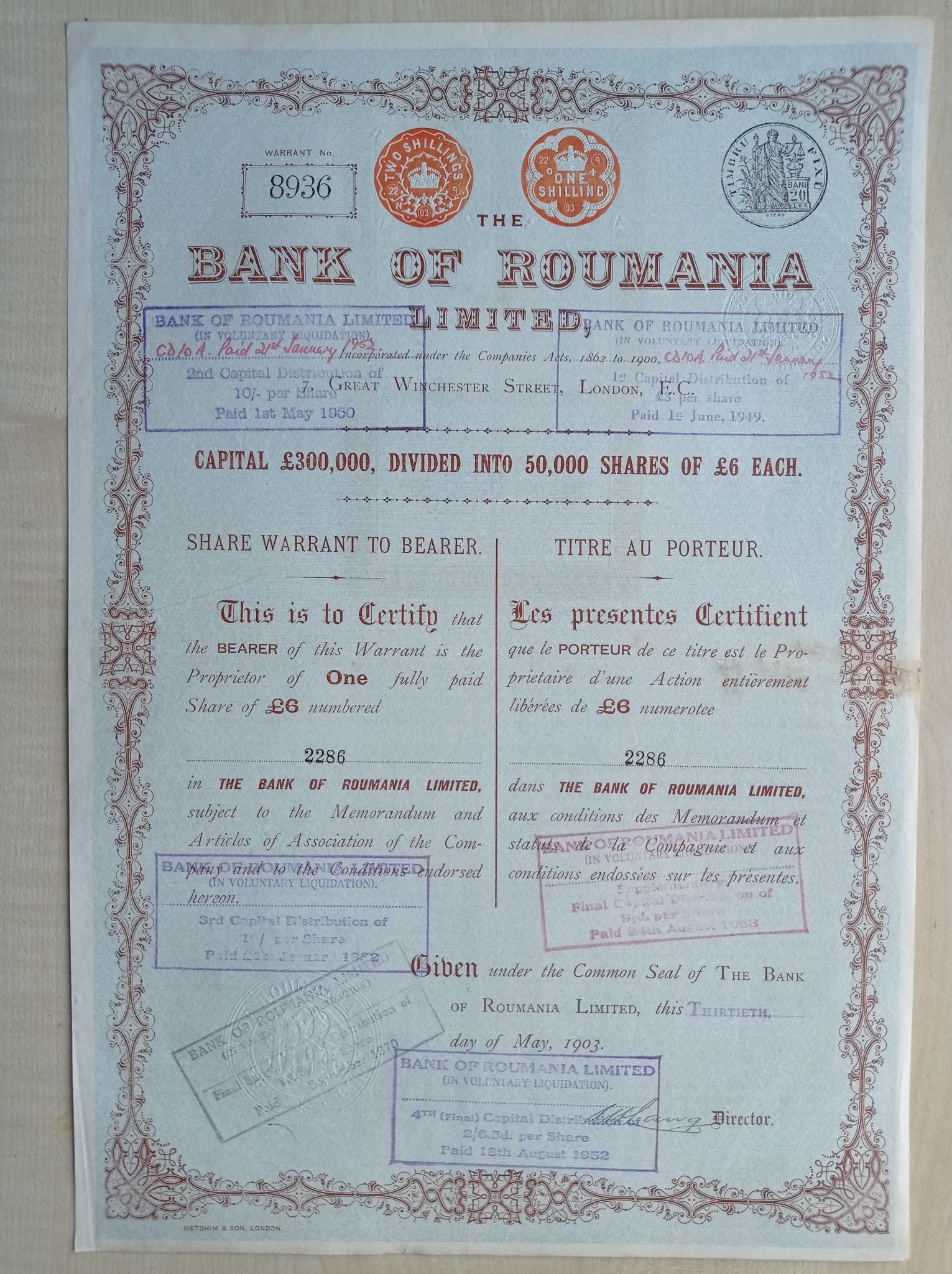 Anglo-Romanian bank share issued in London in 1903 for £6. With tax stamps and liquidation stamps dated through the 1950s. Rare bearer certificate from Bank of Roumania Ltd., reflecting early international finance ties between London and the Romanian banking system.