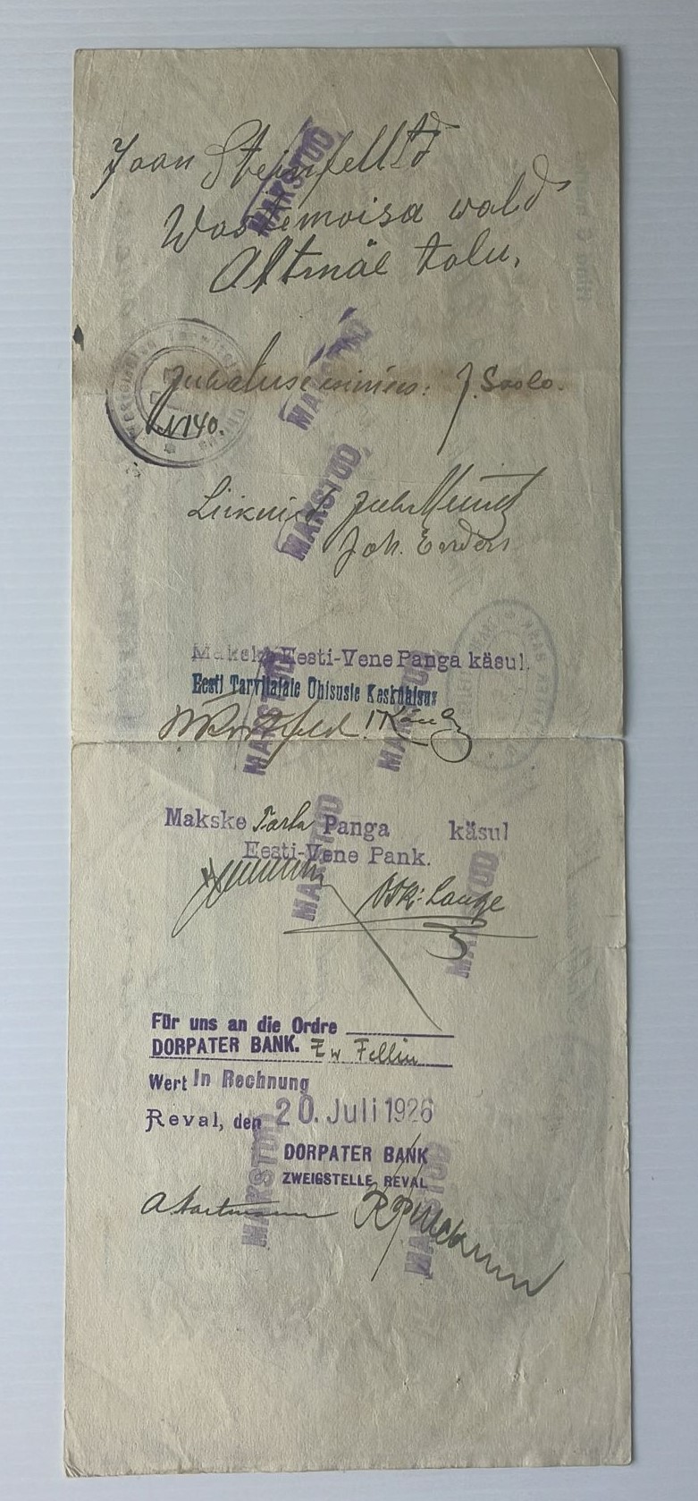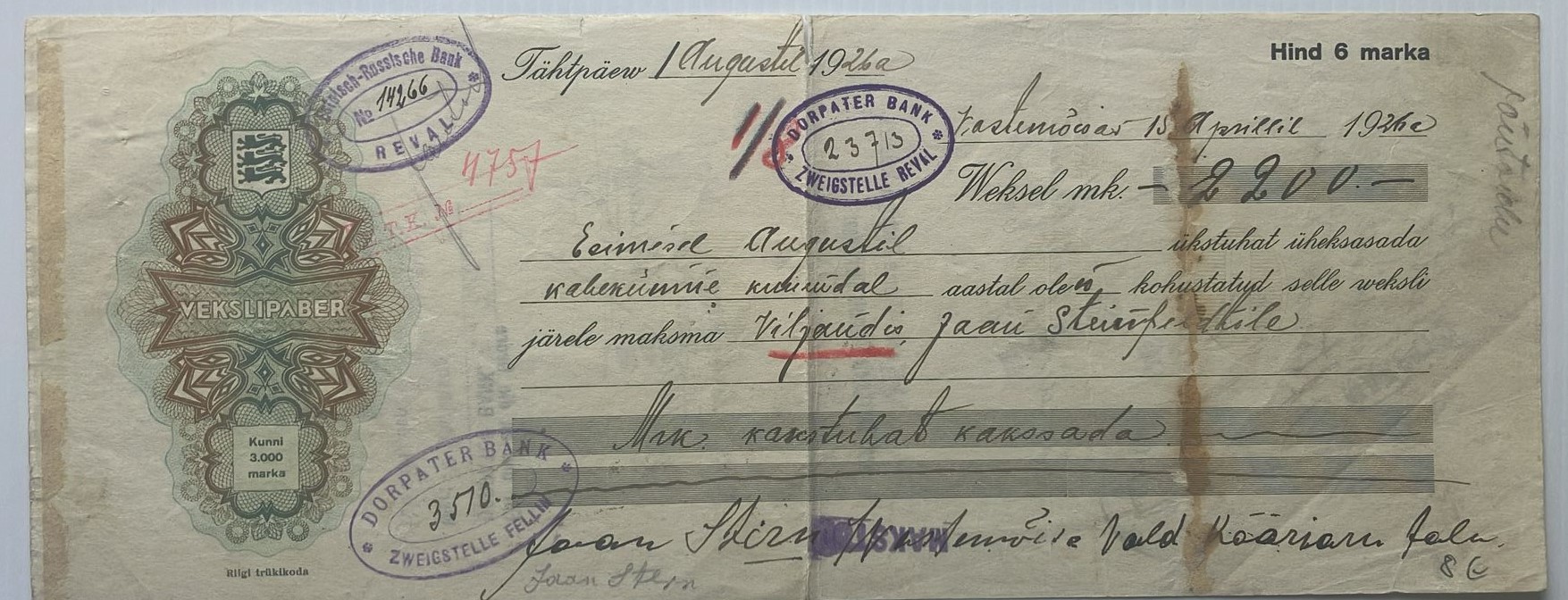 Rare Estonian promissory note (vekslipaber) from 1926, issued in Tartu. Includes multiple bank stamps from the Russian-Estonian Bank, Dorpater Bank Zweigstelle Reval and other endorsements. A document with financial and regional historical significance.