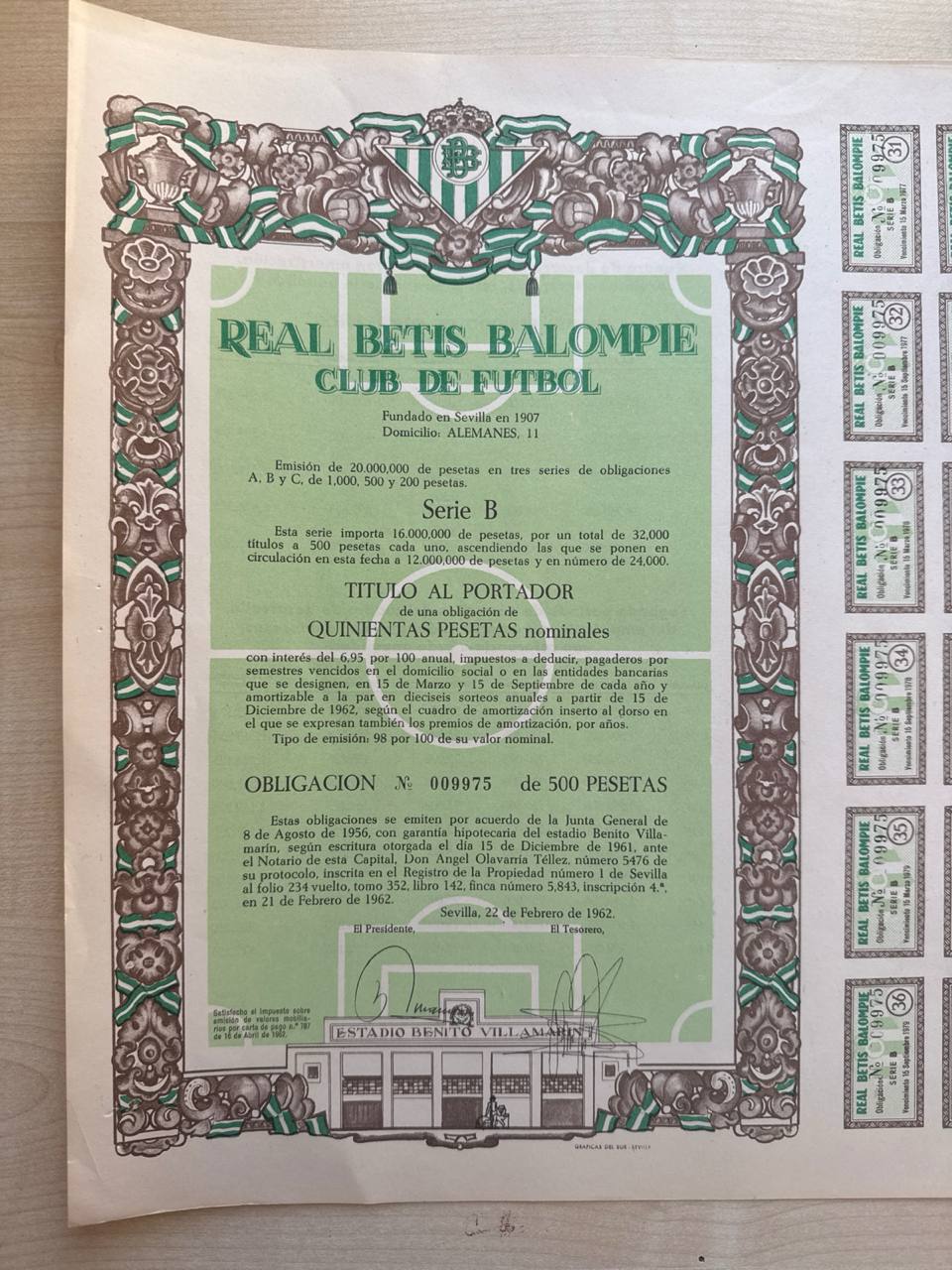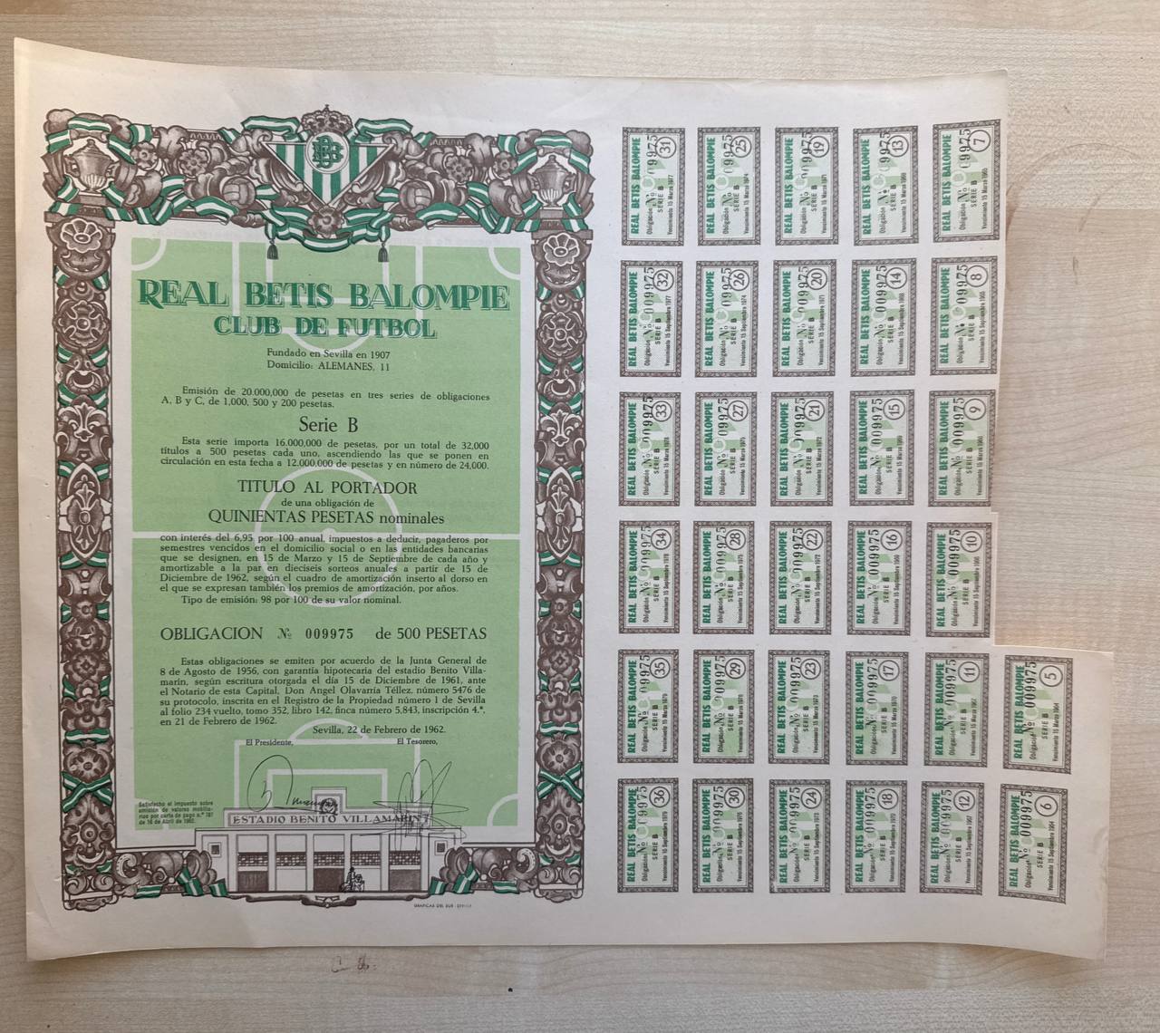 This is a Real Betis Balompié Club de Fútbol bond from 1962, issued in Seville, Spain. It is a Serie B bearer bond with a nominal value of 500 pesetas. The bond includes a sheet of coupons on the right side, which were likely used to collect interest payments over time. The bond is beautifully decorated with an ornate border featuring the club’s colors (green and white) and crest, along with an illustration of the Estadio Benito Villamarín at the bottom.