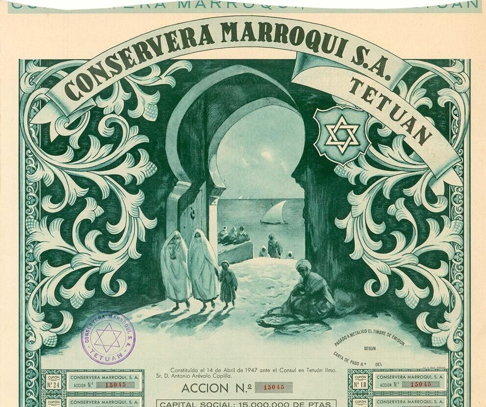 Rare and beautifully designed share certificate issued by Conservera Marroquí S.A. in Tetuan, part of the former Spanish Protectorate in Morocco. Dated April 14, 1947, this certificate represents one share with a nominal value of 500 pesetas, part of the company’s capital of 15,000,000 pesetas, divided into 30,000 shares.