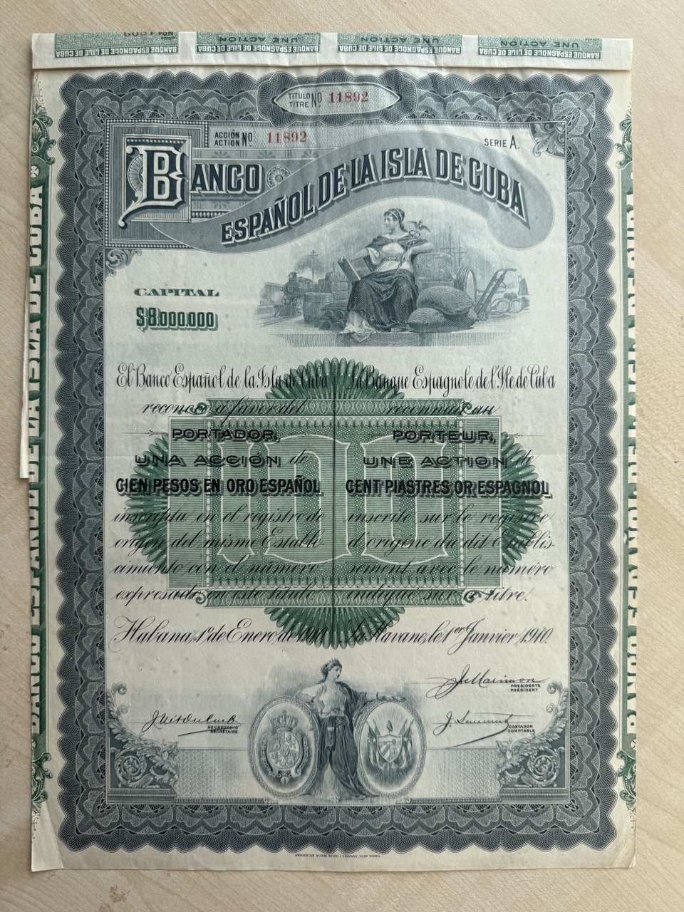 An impressive share certificate from the Banco Español de la Isla de Cuba, issued in Havana in 1910. This institution played a pivotal role in colonial-era Cuban finance under Spanish oversight. Beautifully engraved with allegorical figures and national coats of arms, and valued at 100 Pesos in Spanish gold. A sought-after piece of Caribbean financial history.