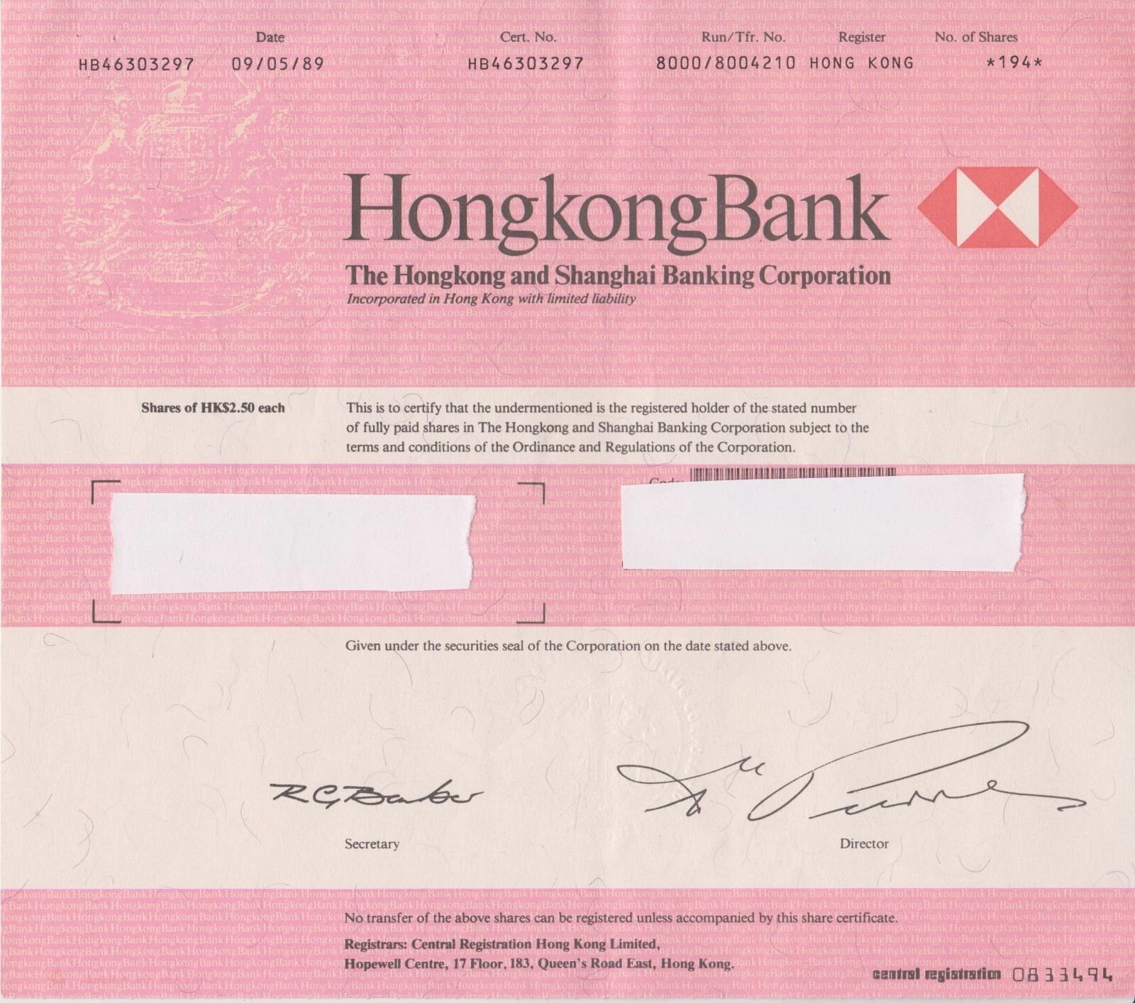 Modern share certificate issued by the iconic HSBC (HongkongBank), representing 194 shares of HK$2.50 each. Dated 09 May 1989, it reflects the period before HSBC’s global headquarters moved to London. The bank was originally founded in 1865 to finance trade between Europe and Asia and has since grown into one of the largest financial institutions globally.