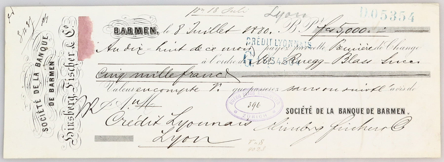 Germany Societe de la Banque de Barmen 'Hinsberg, Fischer & Co' Wechsel (Bill of Exchange) for 5000 Francs 1880
