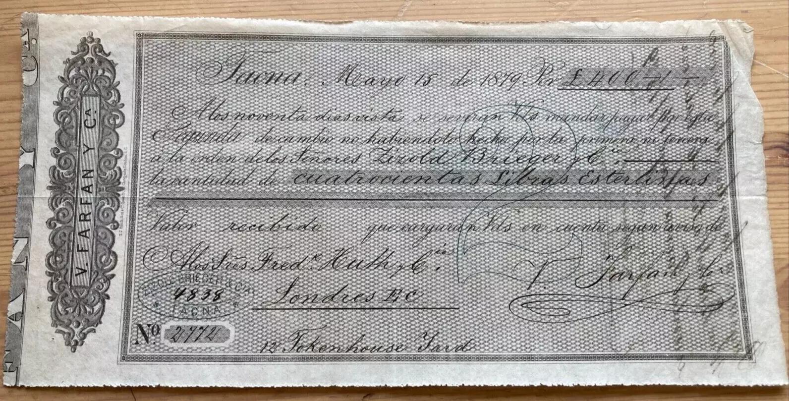 Peru Bolivia 'Ventura Forfan y Cia' 1879 Tacna Letra de Cambio Bill of Exchange