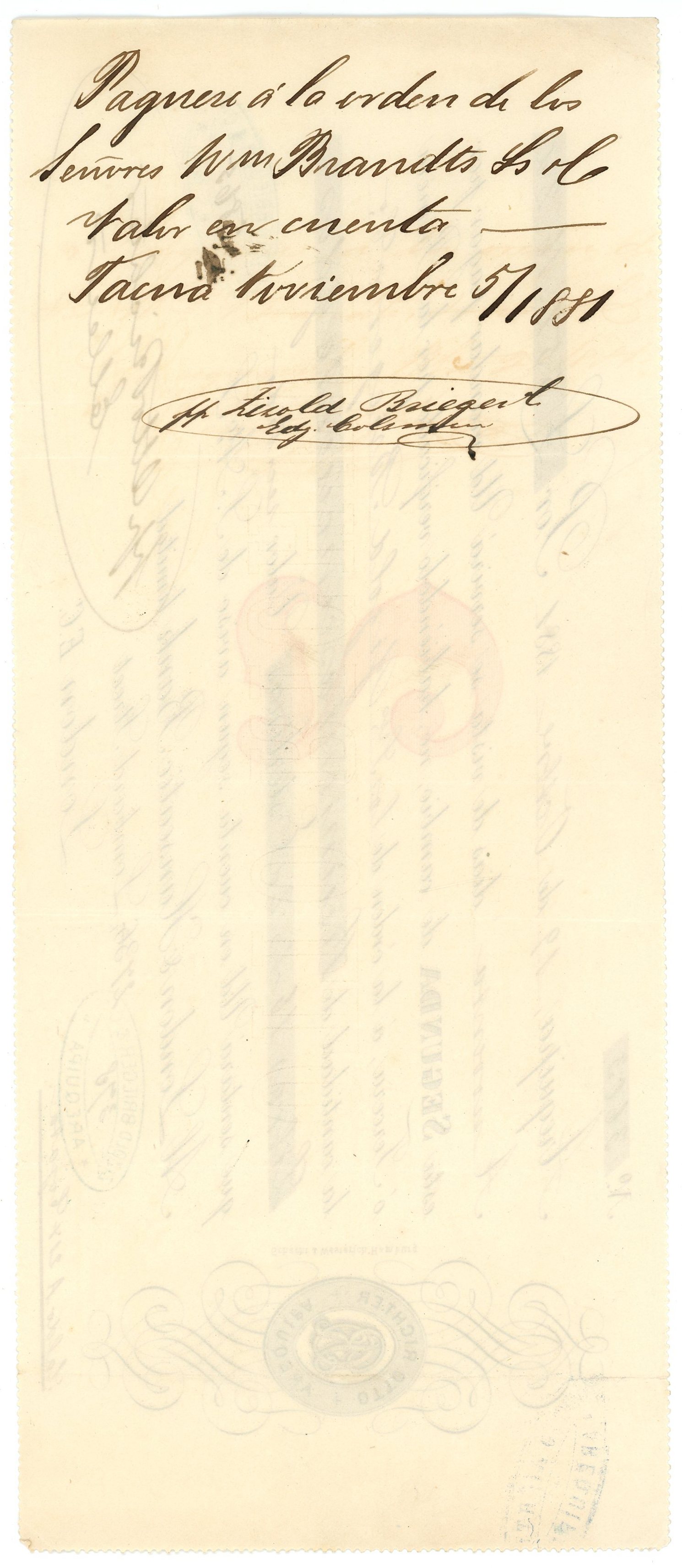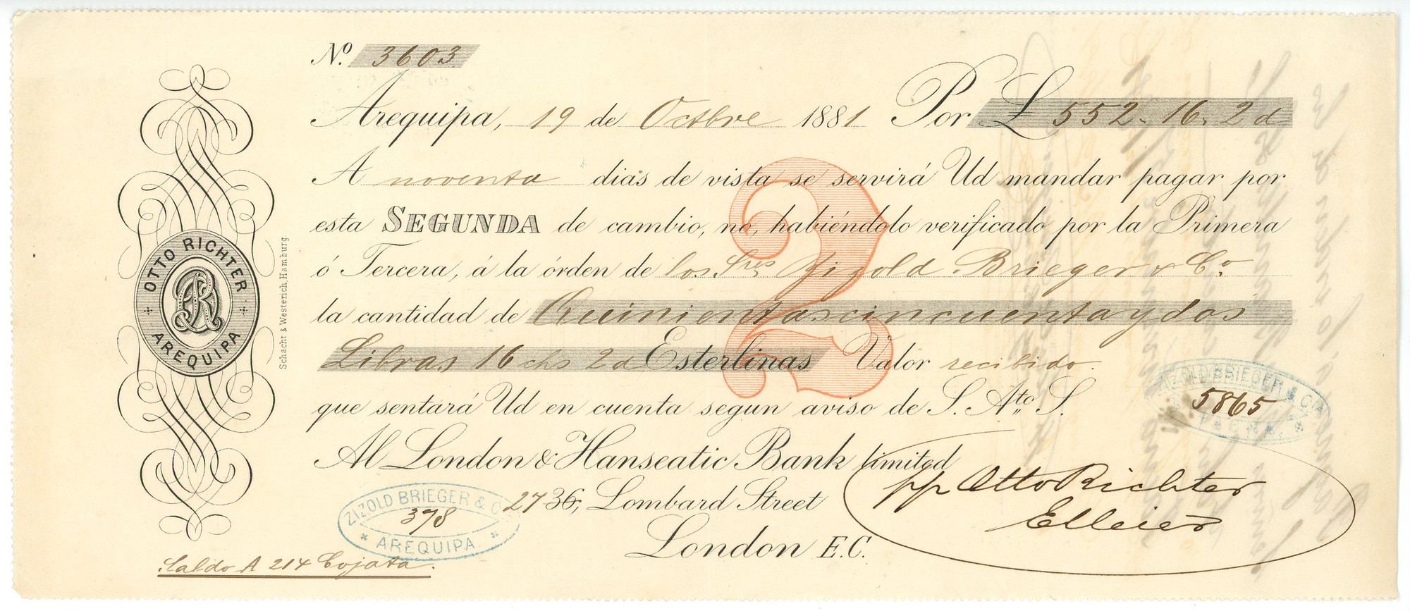 Peru Otto Richter Bill of Exchange Arequipa 1881 Cheque Letra de Cambio