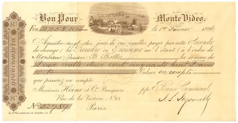 Uruguay Banco Comercial de Montevideo Bill of Exchange Letra de Cambio 1896
