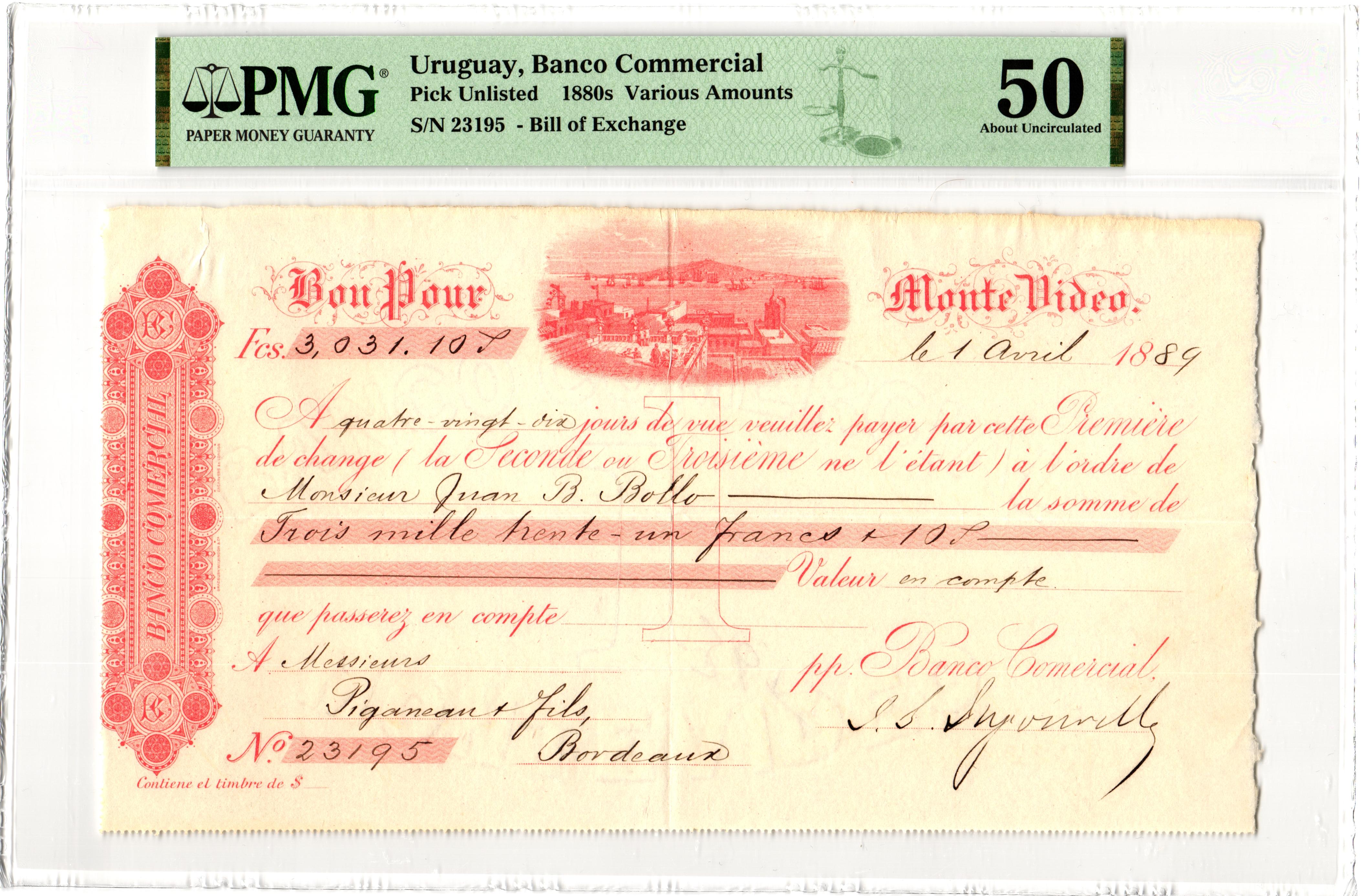 # S/N 23195 Bill of Exchange for 3,031.10 Francs; Banco Comercial was authorized to issue bank notes until 1886, when it renounced this privilege in disagreement with the decisions of the State. PMG 50 About Uncirculated 200