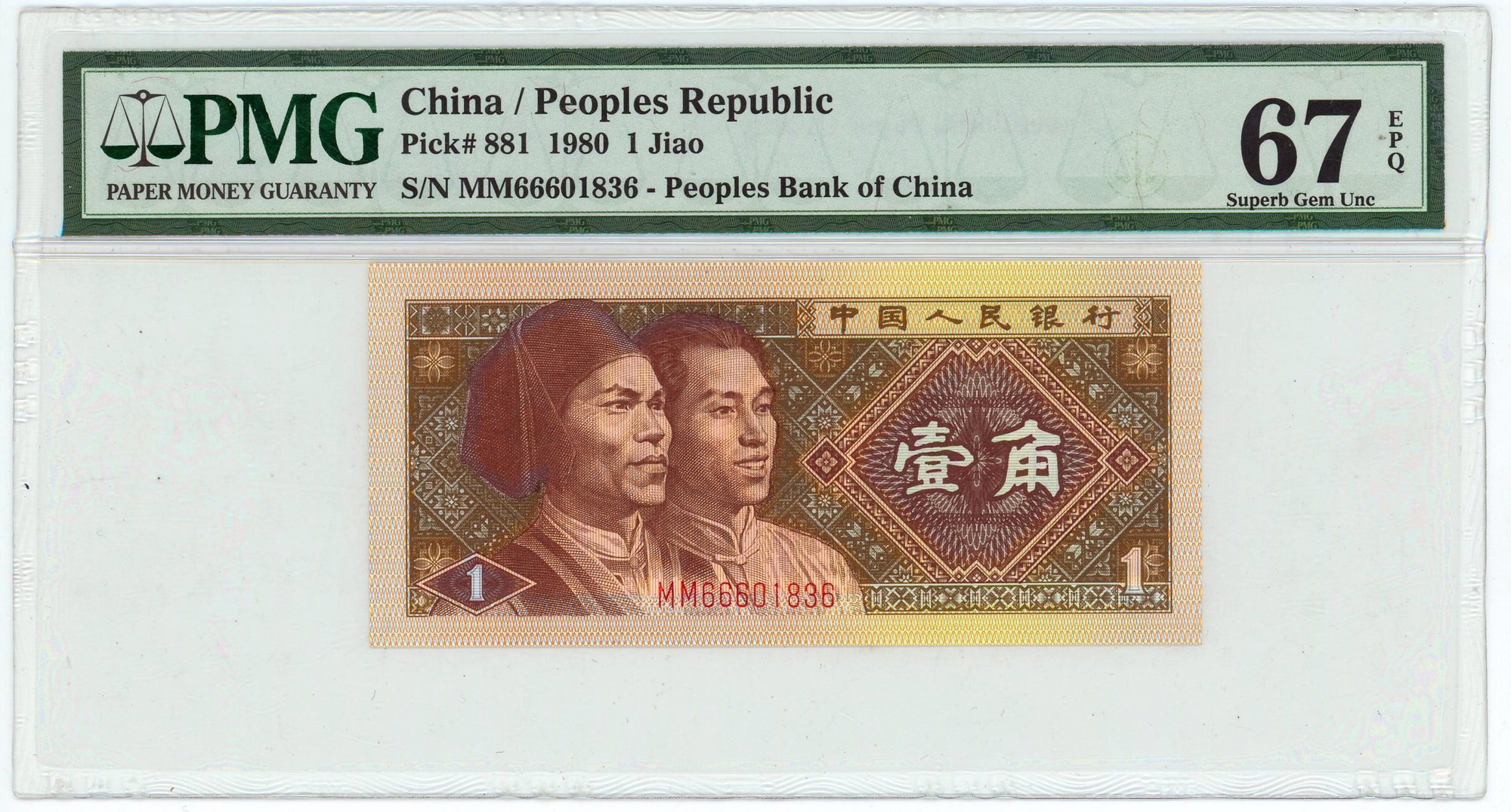 China 1 Jiao 1980 PMG 67 EPQ Superb Gem UNC