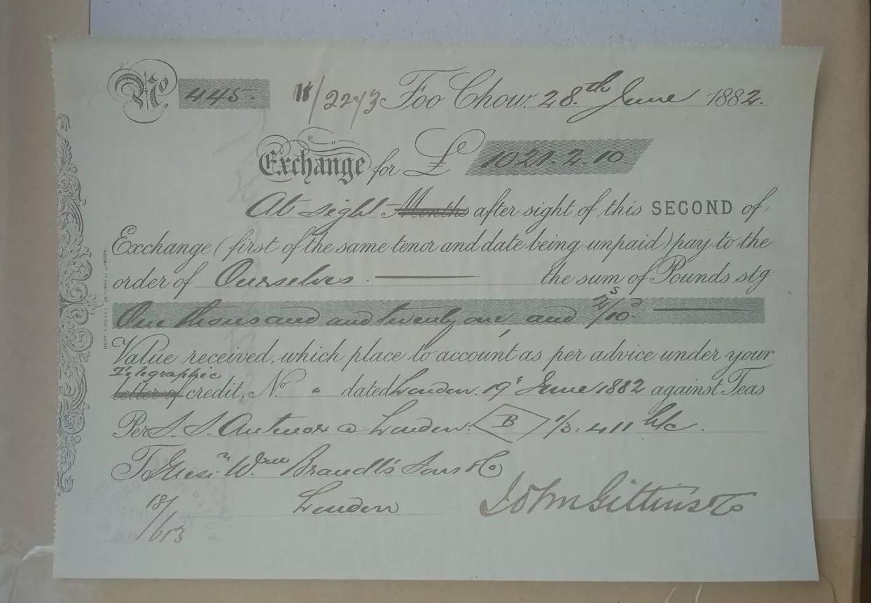 John Gittens & Co Fuzhou (Foochow) Fujian China Bill of Exchange 1882