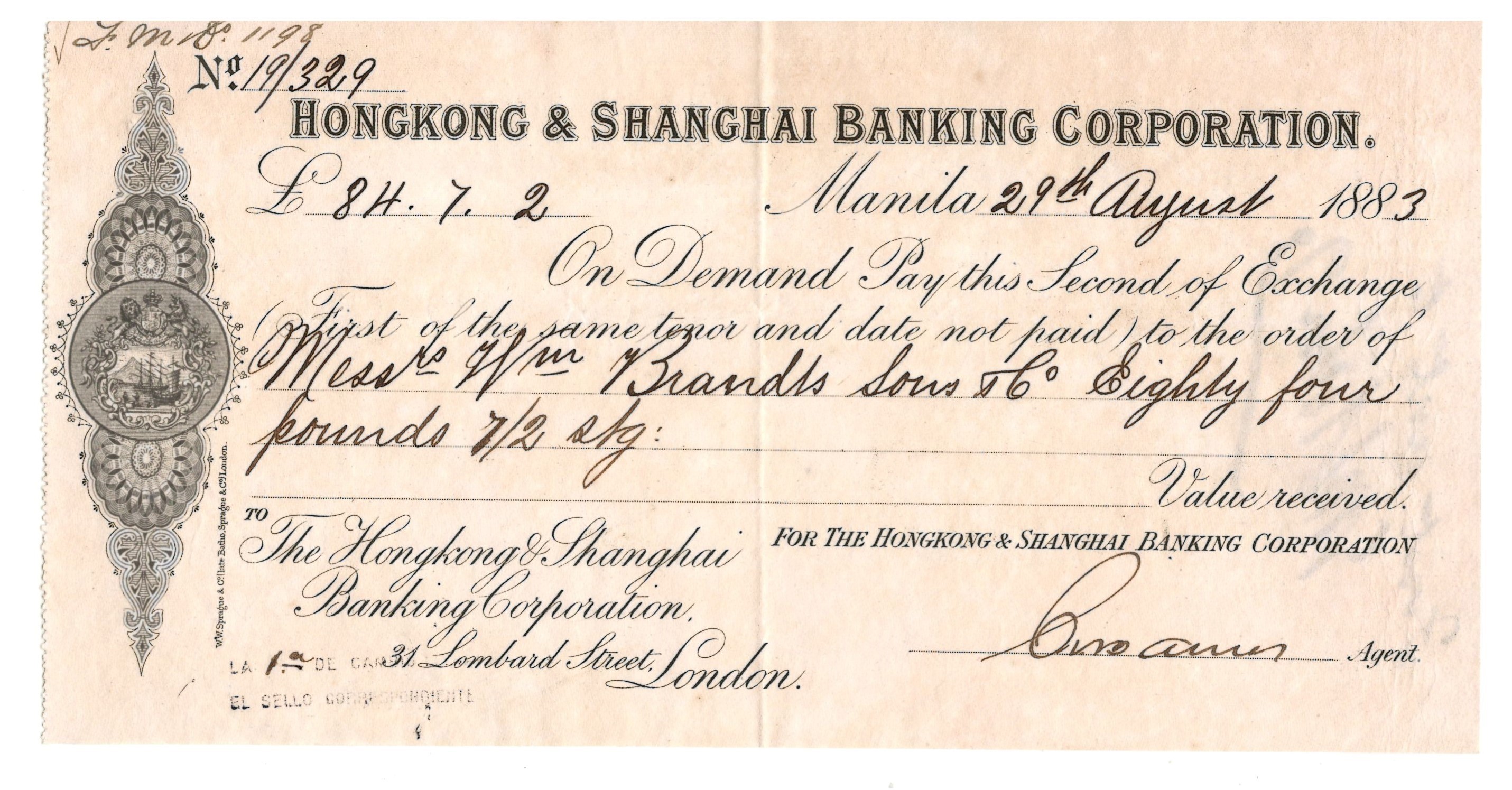 Scarce and historically significant Second of Exchange issued by the Hongkong & Shanghai Banking Corporation (HSBC) from its Manila branch on 29 August 1883, payable to Messrs. Wm. Brandts Sons & Co. in the amount of £84.7.2 Sterling. Drawn on HSBC’s London office at 31 Lombard Street.