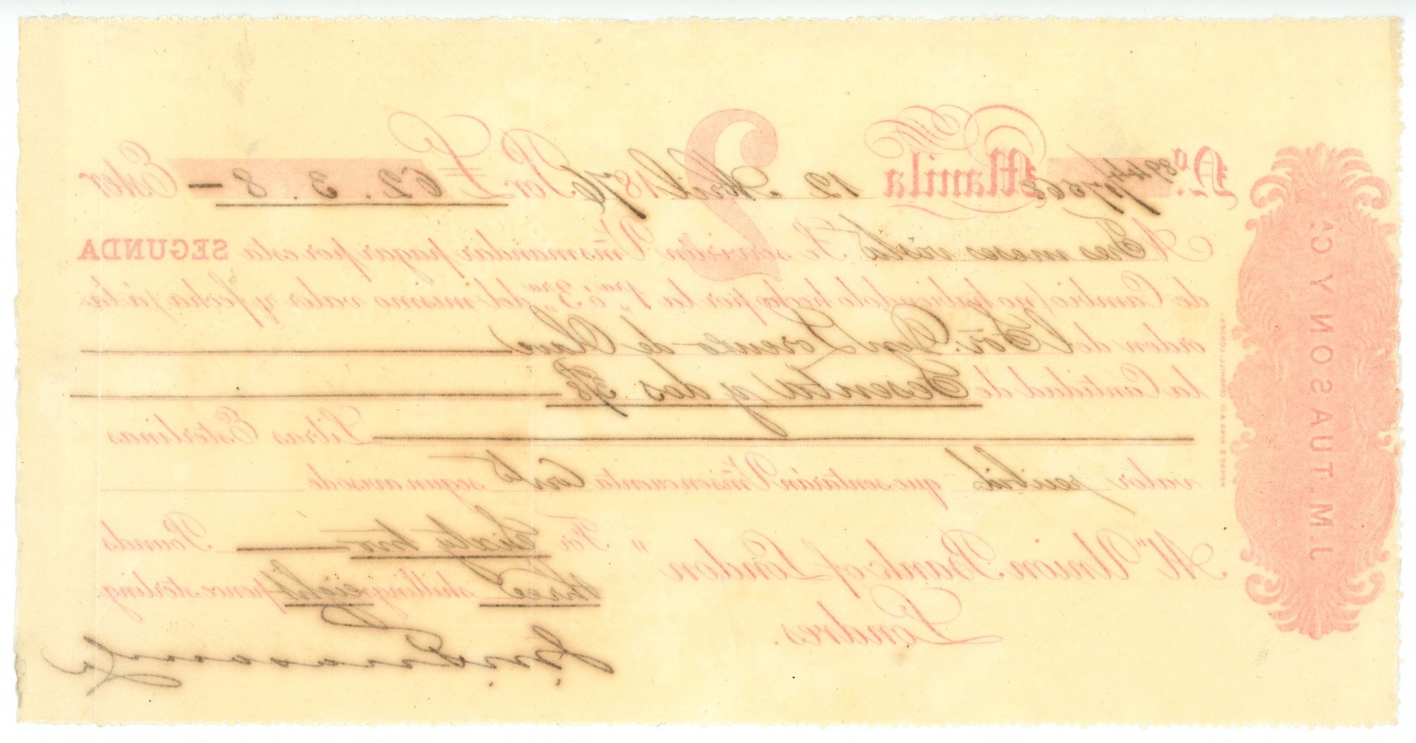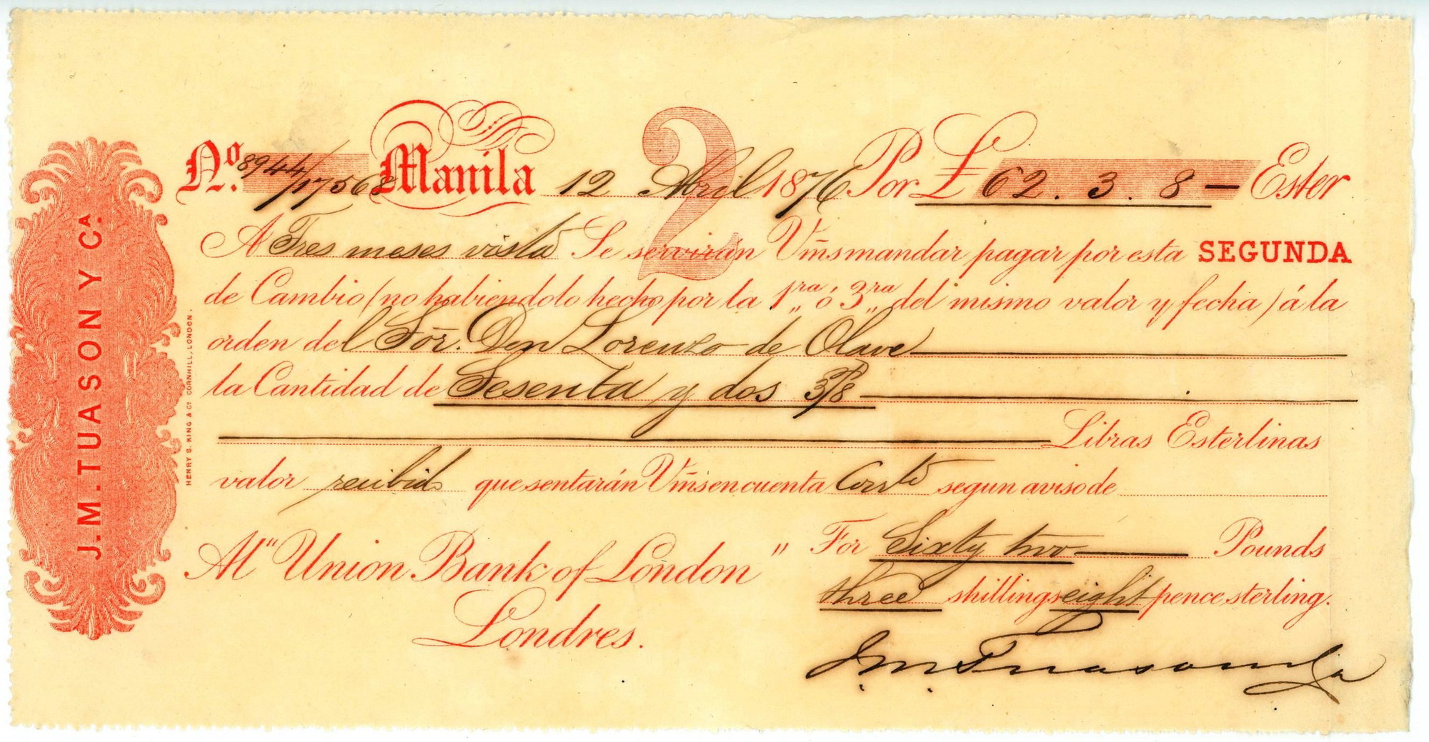 Manila Bill of Exchange; Scarce Second of Exchange drawn in Manila on Union Bank of London by Jose Maria Tuason & Compania. Don Jose Maria Tuason, one of the most prominent merchants, bankers, and real estate magnates of mid-19th century, established J.M. Tuason & Co., one of the earliest Filipino-owned merchant firms of the time. In addition to trading, the firm also opened a banking house in the 1860s, receiving deposits, as well as issuing bills on London and Madrid, as well as discounting commercial paper. In addition, Don Jose Maria Tuason was nominated as the first manager (gerente) of the Banco Español-Filipino de Isabel II (1853-1856), precursor of the Bank of the Philippine Islands. The Tuasons are descended from an intermix of Chinese, Spanish and Filipino families. The great patriarch of the Tuasons was a Chinese immigrant from Fukien, Son Tua who settled in Binondo, Manila in the early 18th century. He came to Manila to engage in the galleon trade. Quickly amassing wealth because of his business acumen, he became possibly the richest man in the Philippines by the second half of the 18th century; UNC