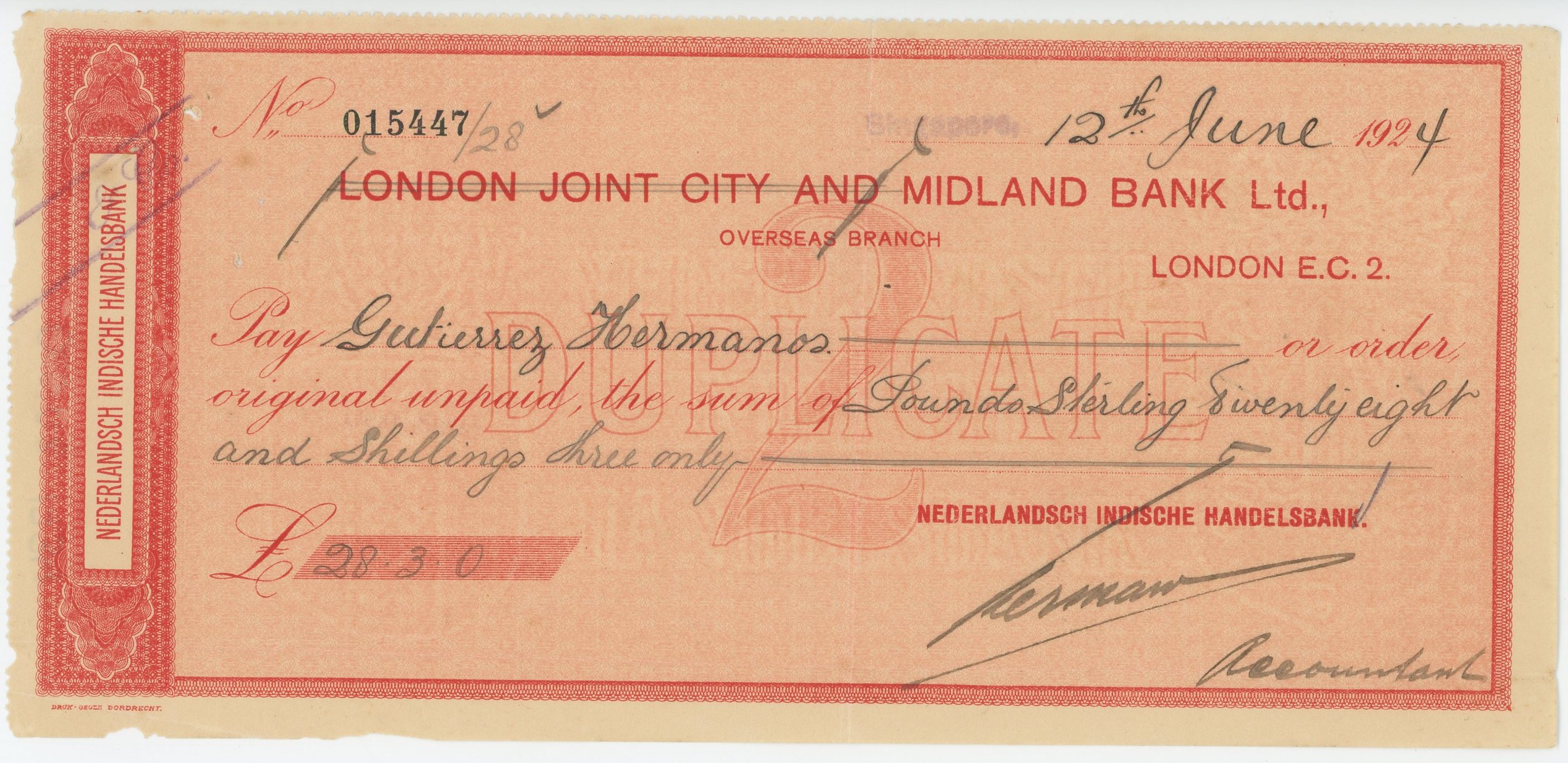 Singapore Nederlandisch Indische Handelsbank £28.3.0 1924