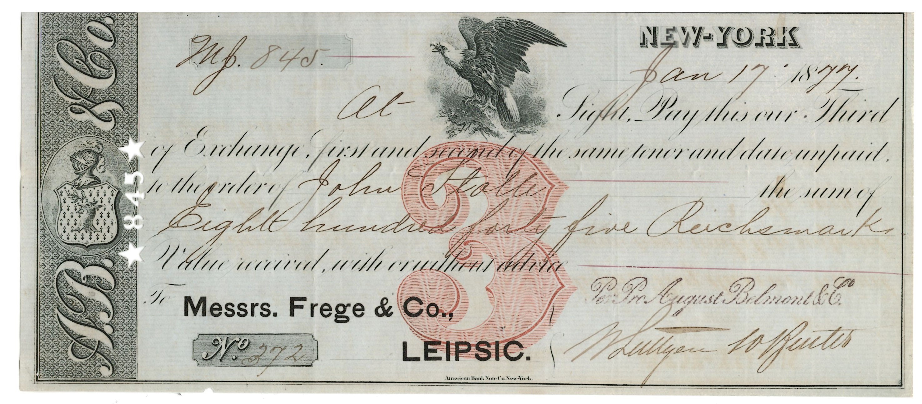 U.S. New York 1877 Bill of Exchange August Belmont & Co. to Frege & Co., Leipzig