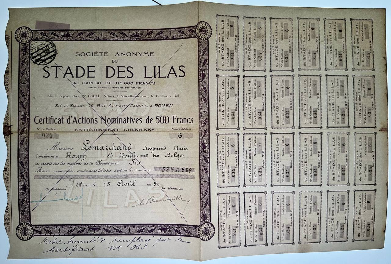 France Football Stade de Lilas Rouen Action de 500 Fr 1920