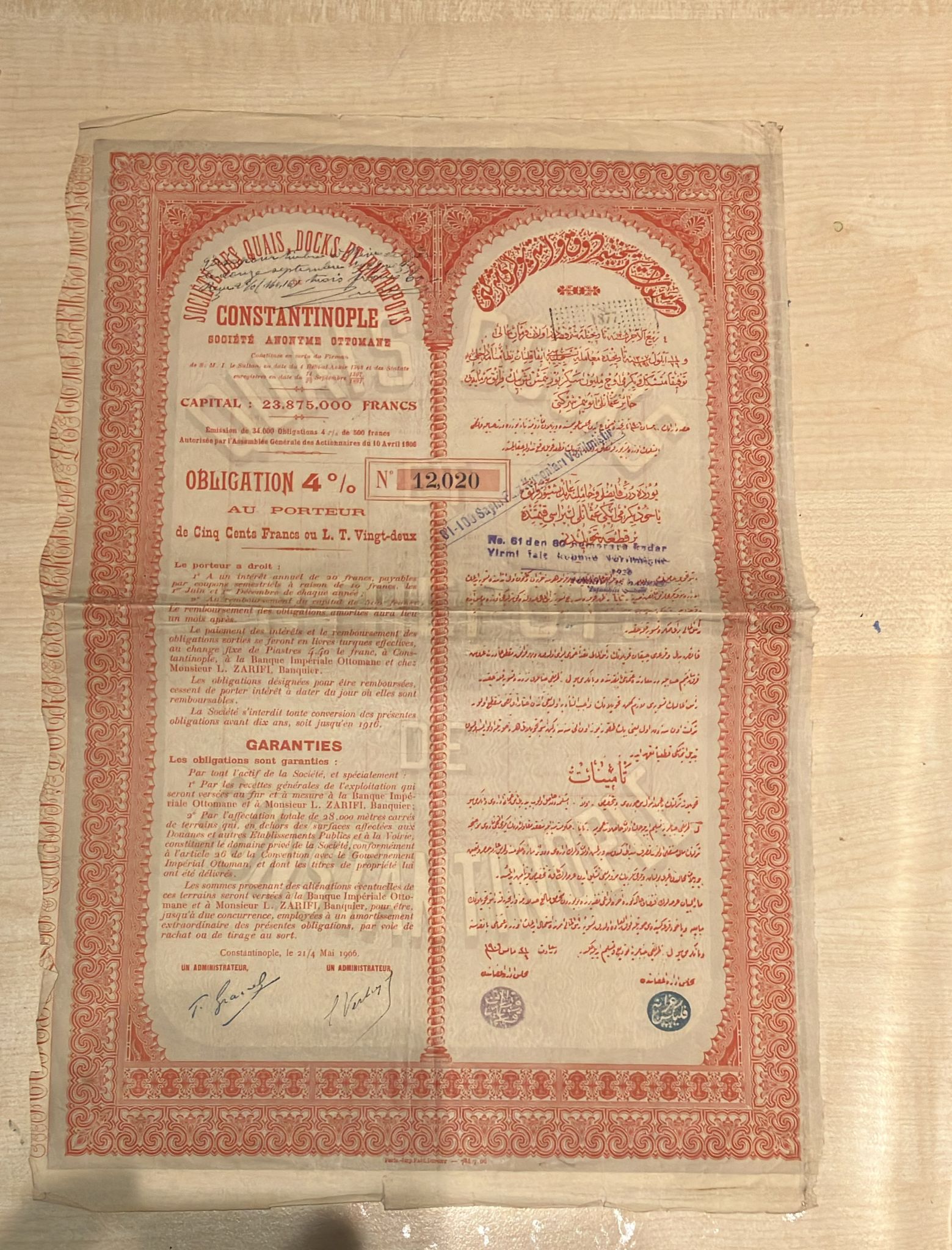 Ottoman 'Quays, Docks and Warehouses Co' 4% Bond of 500F 22 Lt Constantinople
