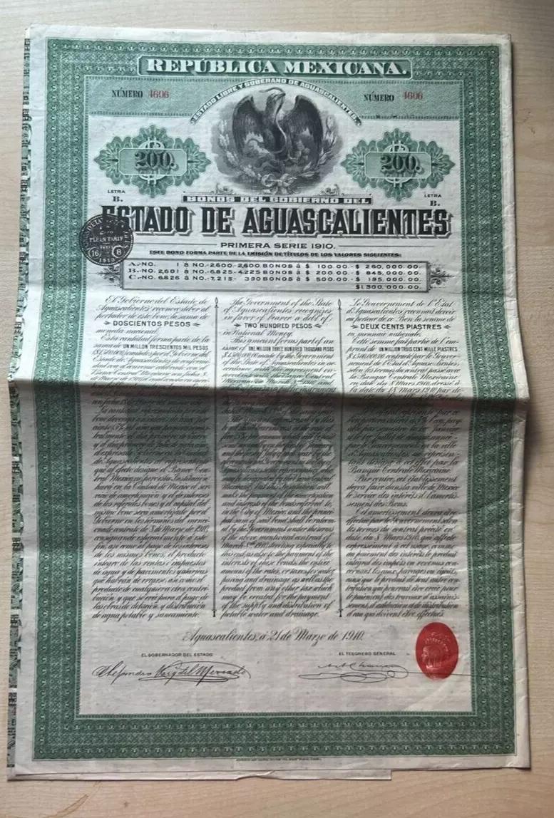 Republica Mexicana 5% Bono Tesoro $100 Loan Aguascalientes Mexico uncancelled coupons