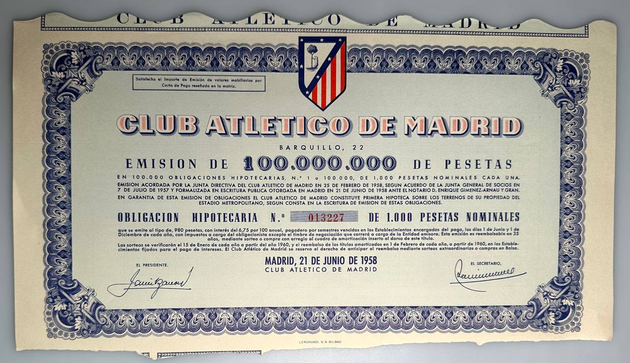 13228 small tears and cuts on the lower edge; the mortgage bond was issued to finance the construction of the Estadio Vicente Calderon in 1950s XF