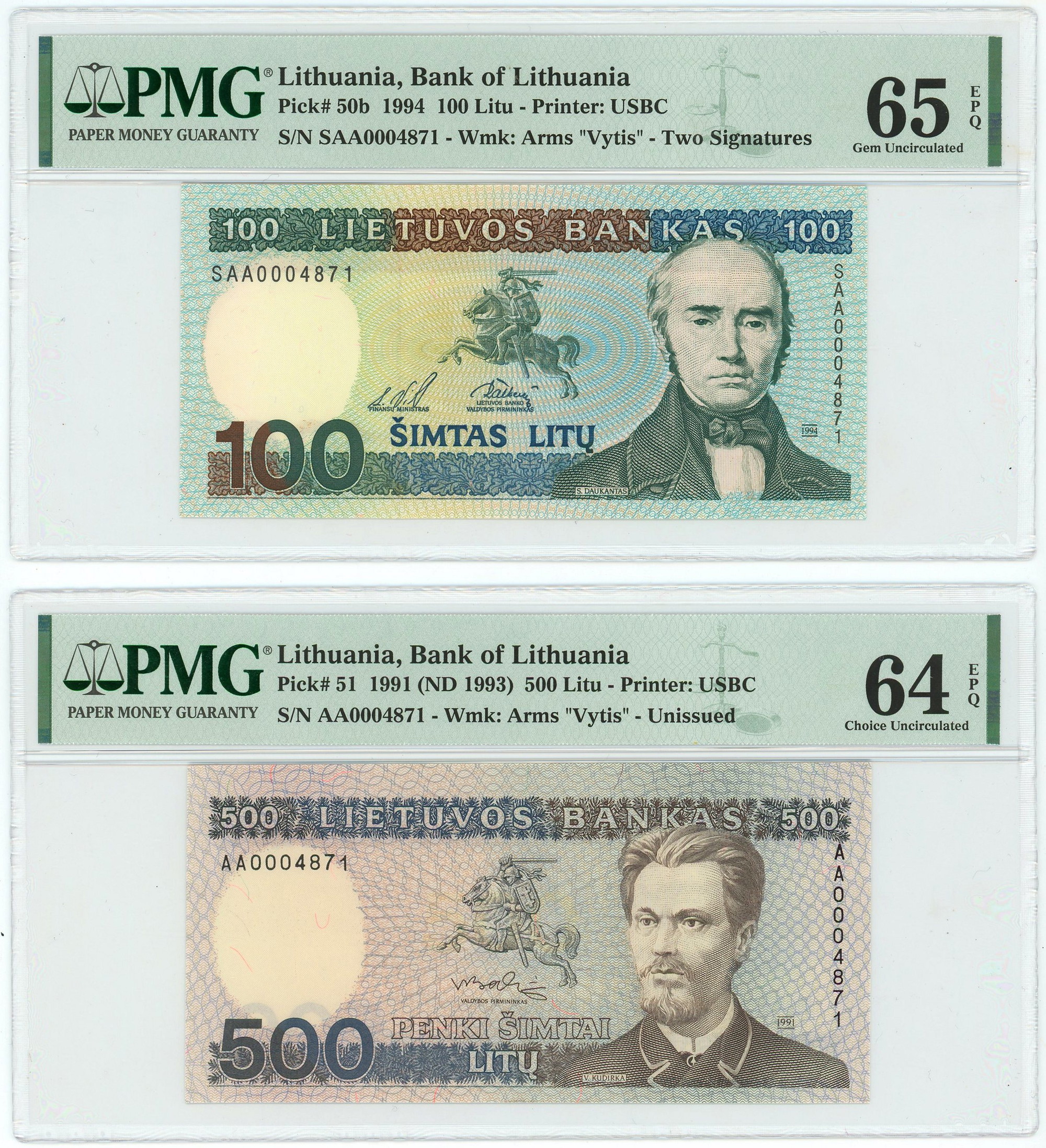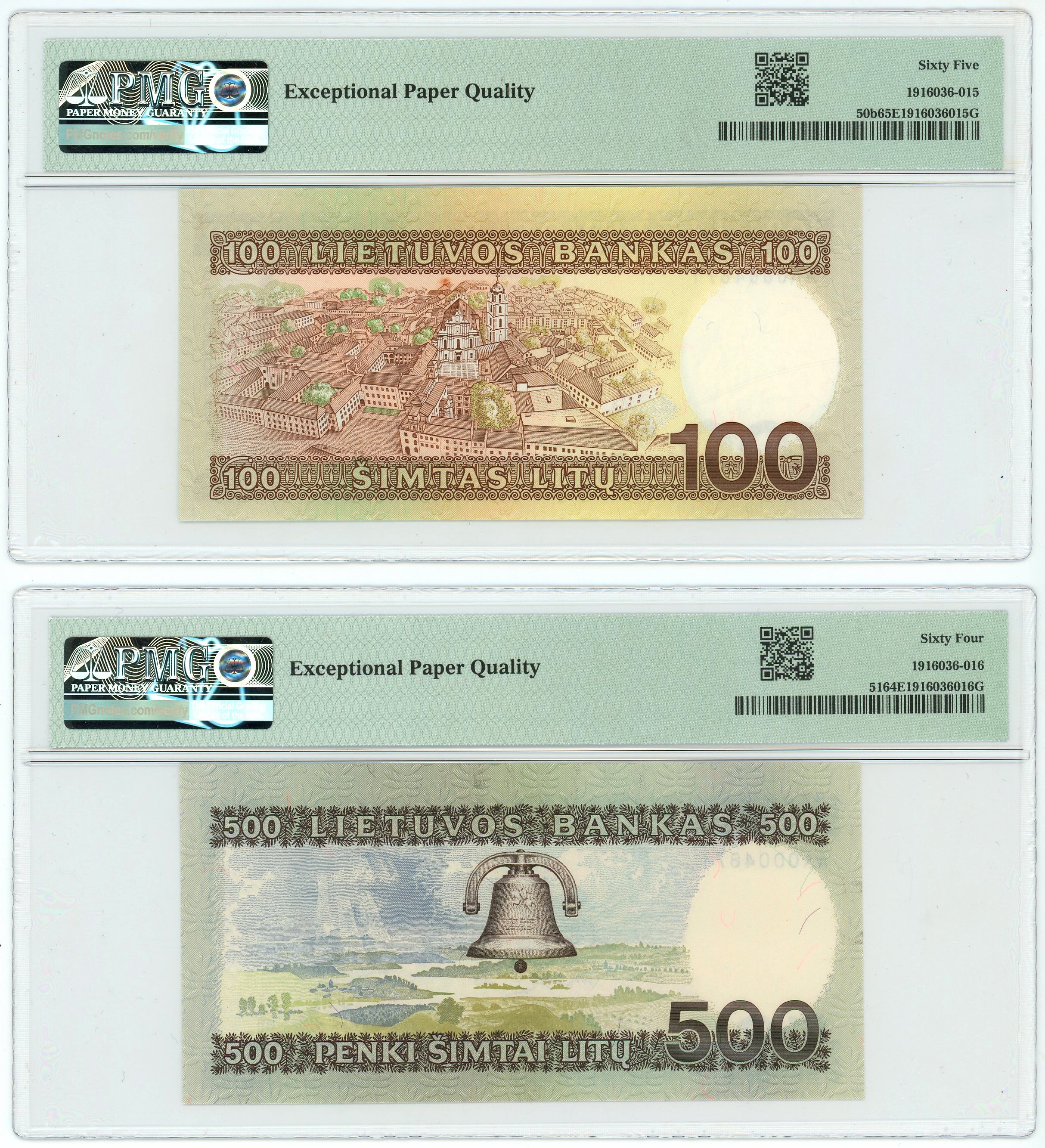 Lithuania 100 - 500 - 1000 Litu 1991 - 1994 The Same Number PMG 64-65 EPQ Gem UNC