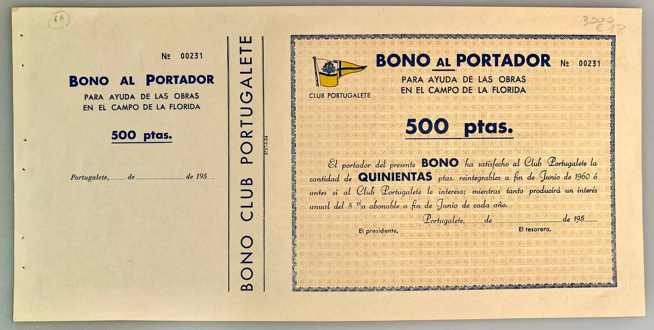 231 Bono de 500 Ptas, unissued; from a football club in the town of Portugalete (Basque Country). VF