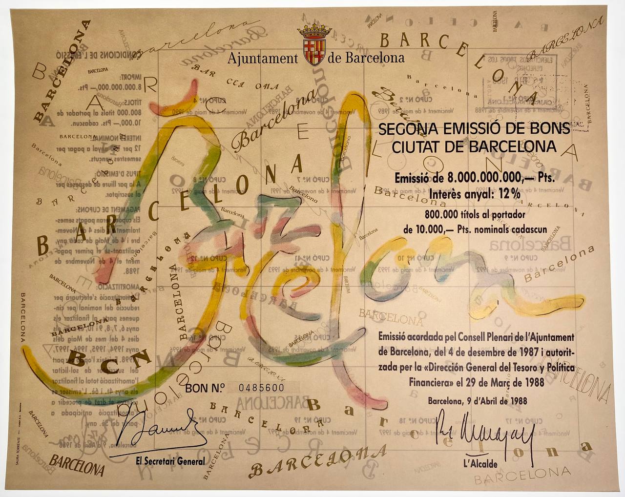 Spain Secona Emisio de Bons Ciutat Barcelona 12% Bond for 10000 Pesetas 1988