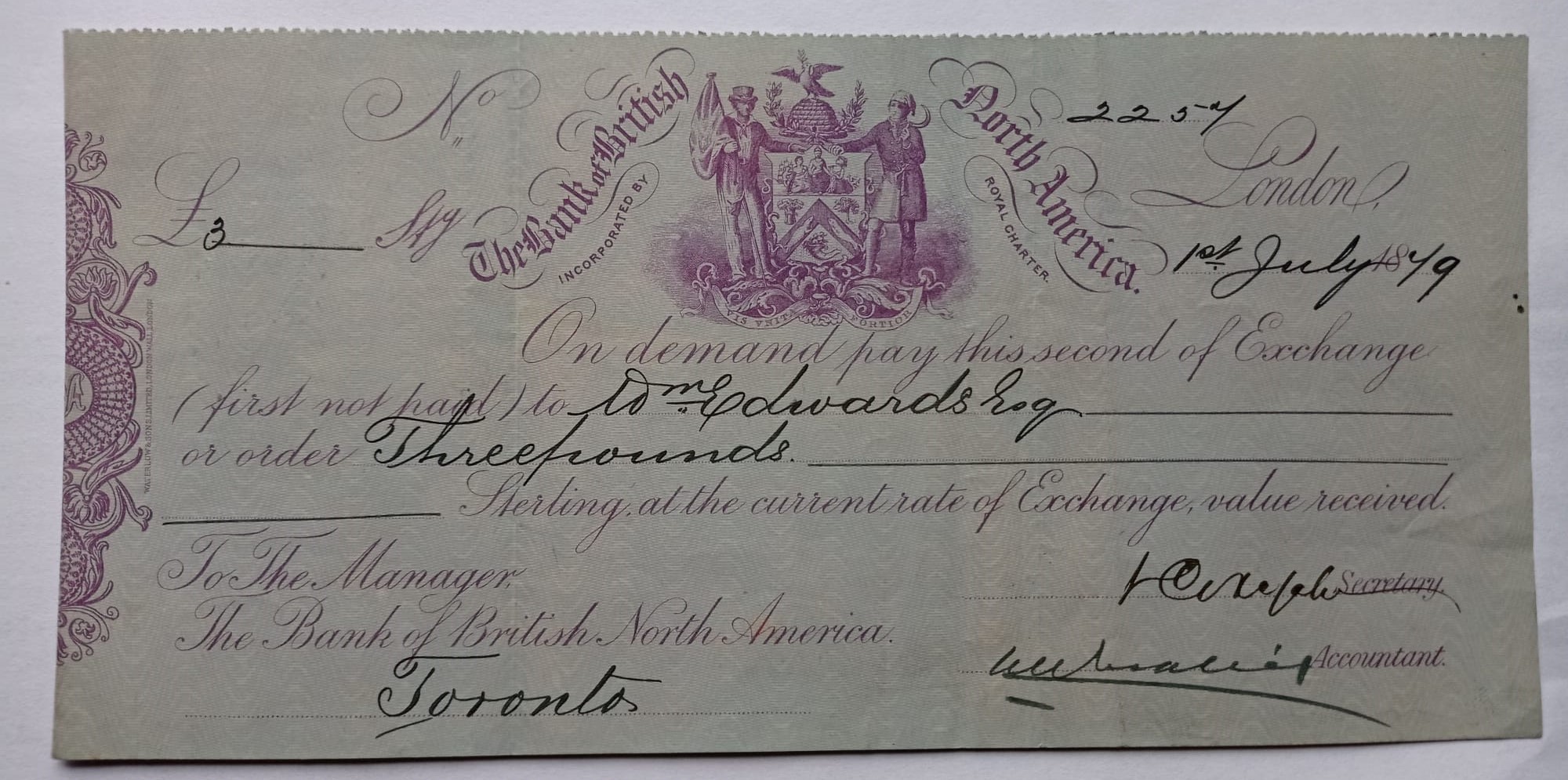 Canada 'Bank of British North America' Bill of Exchange Toronto London 1879