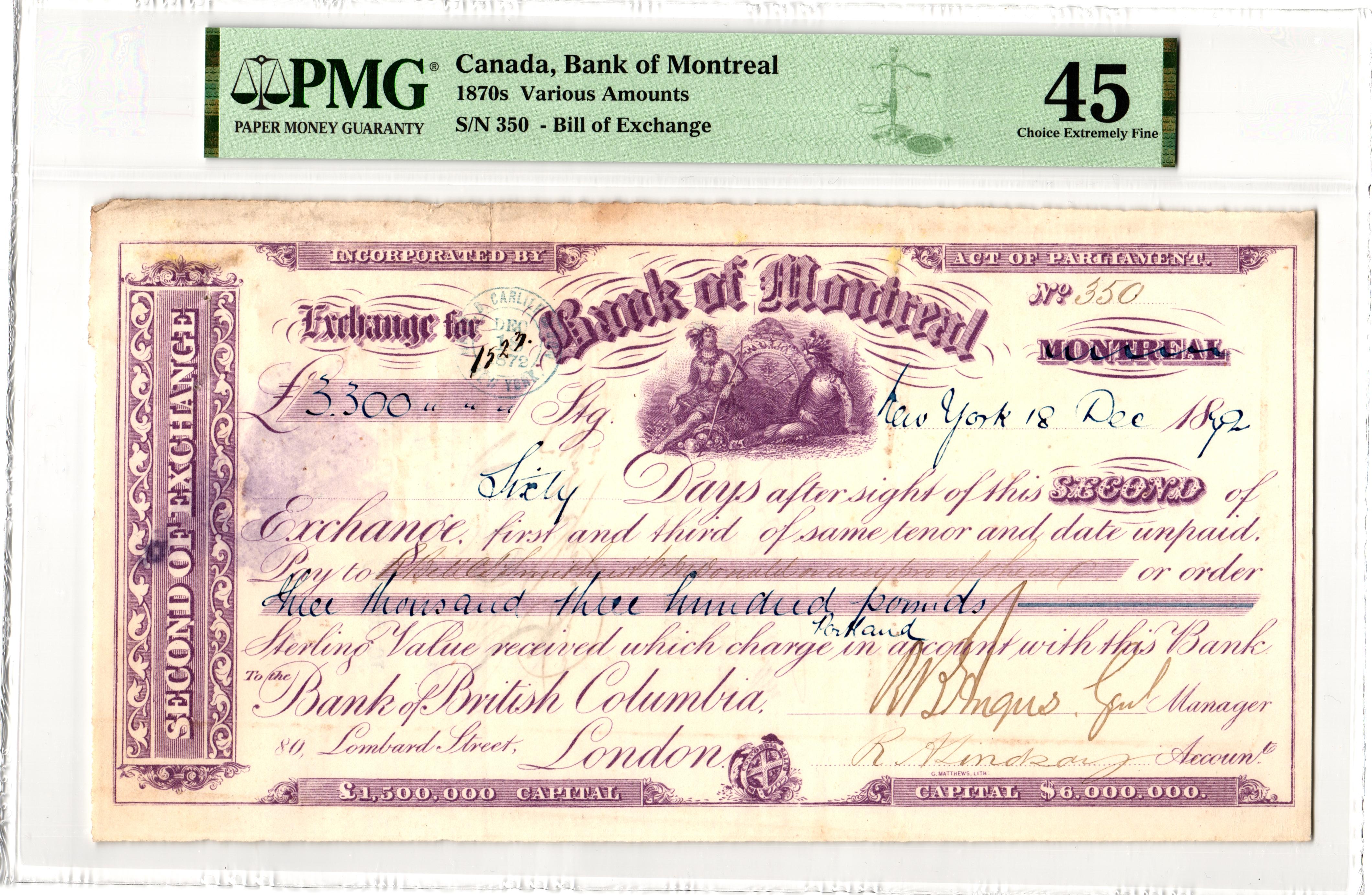 Canada Bank of Montreal 1872 PMG 45 XF Bill of Exchange
