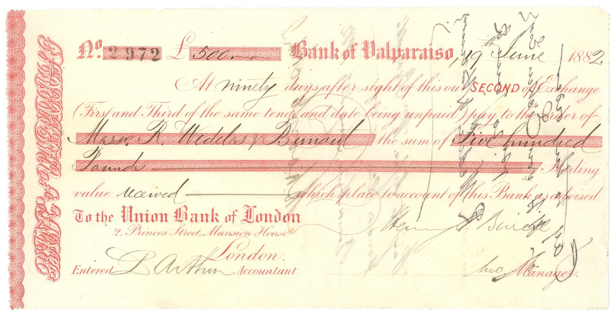 Chile Banco de Valparaiso Bill of Exchange for £500 1882