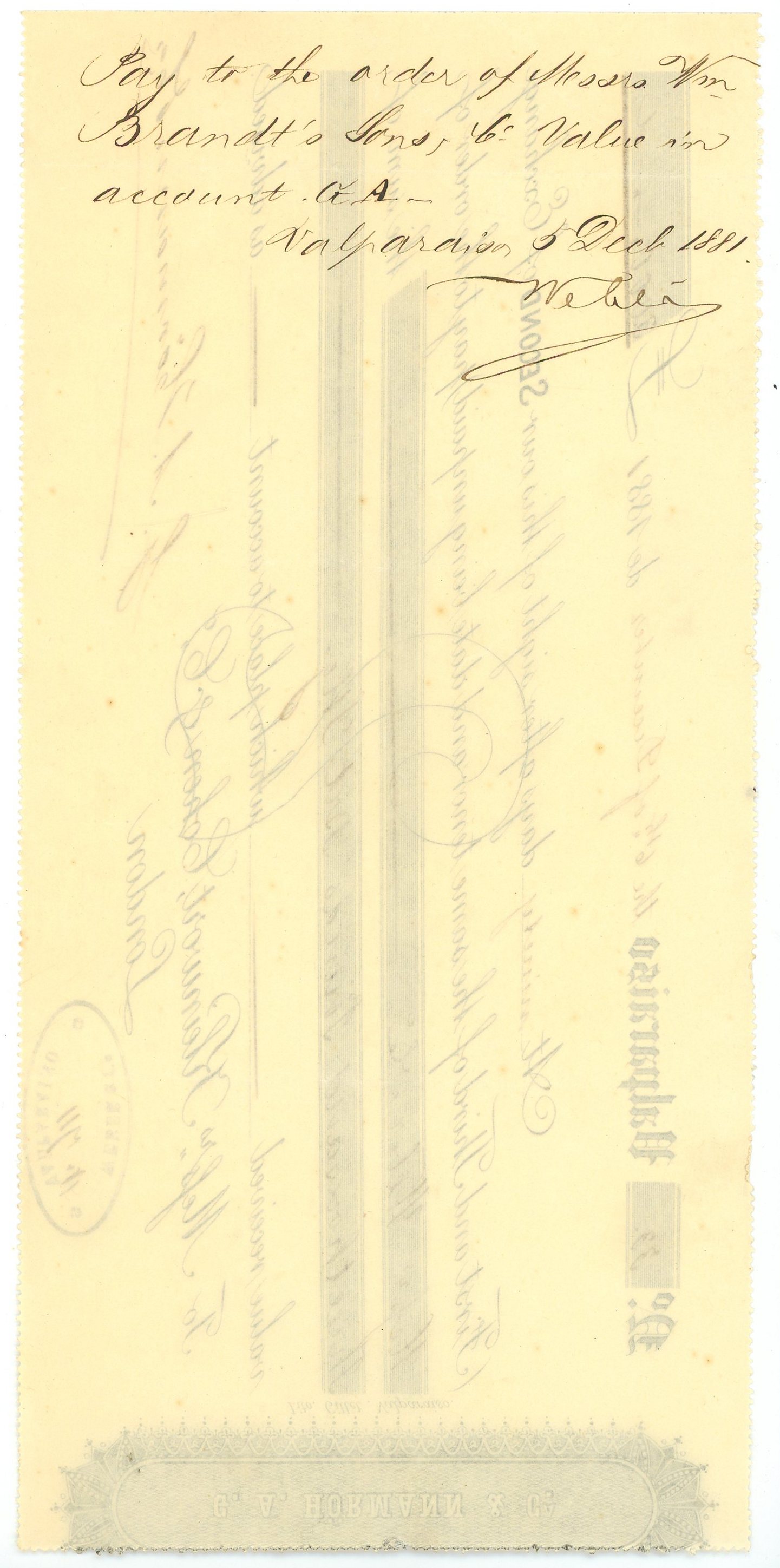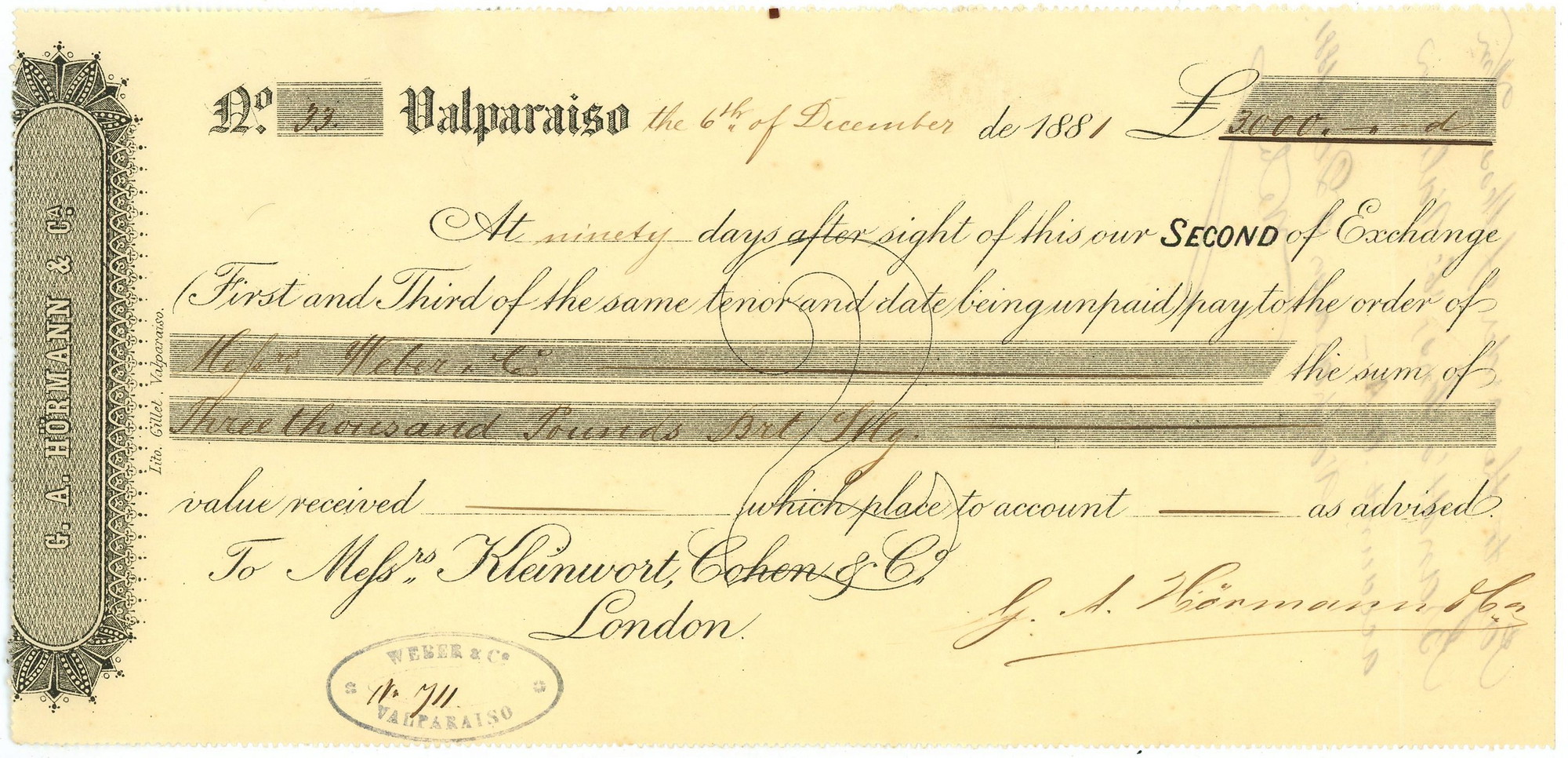 Chile G.A. Hoermann & Co Bill of Exchange for £3000 Valparaiso 1881