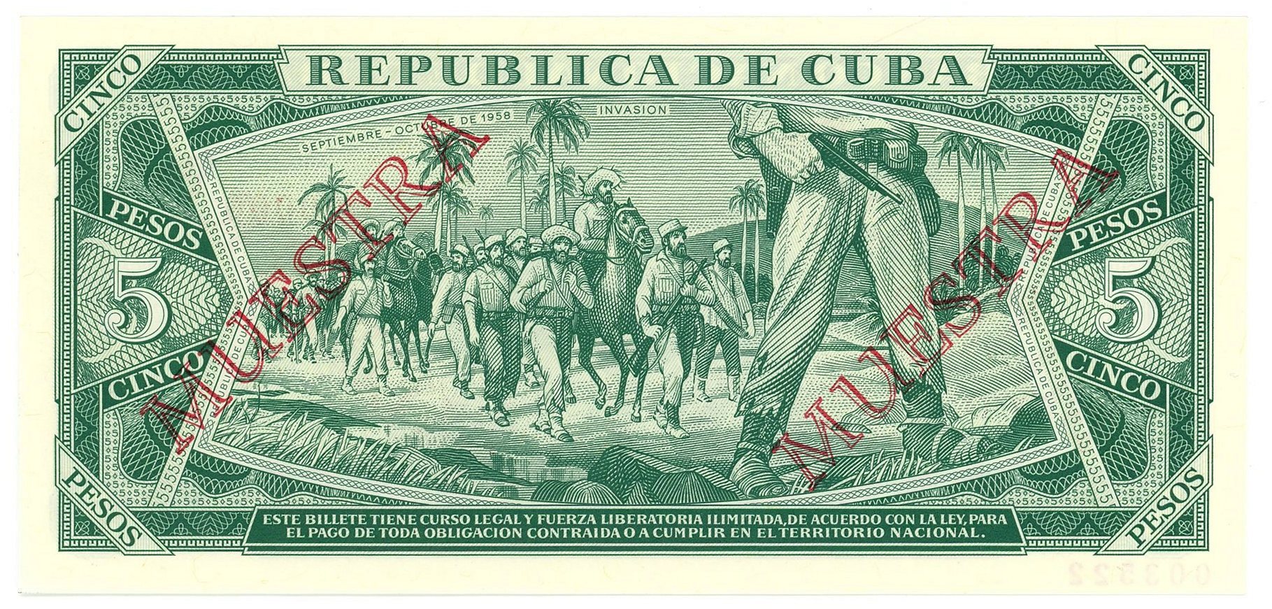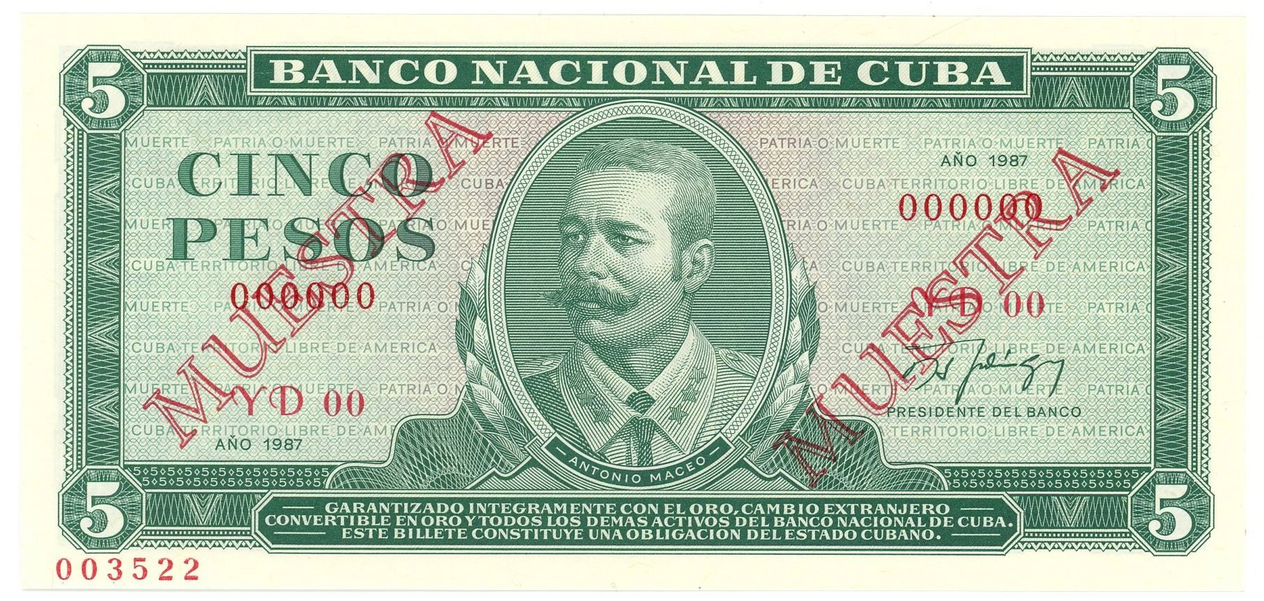 Cuba 5 Pesos 1987 Specimen with black overprint Muestra twice at each side