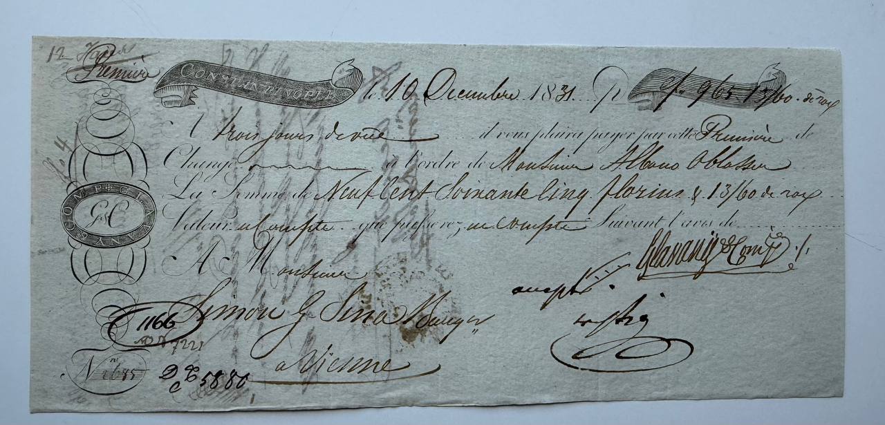 Early handwritten bill of exchange issued in 1831 from Constantinople to Vienna by Glavany Frères. Rich in calligraphy and signed with merchant stamps. Theme: Early 19th Century Trade, Ottoman-European Commerce.