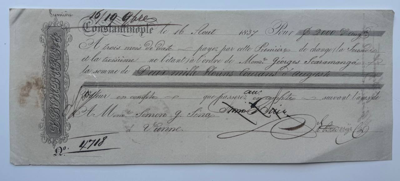 Large format handwritten bill issued in 1837 by Georges Scaramanga in Constantinople to Vienna. Rich merchant document from Greek-Ottoman mercantile elite. Theme: Merchant Banking, Ottoman Diaspora Finance.