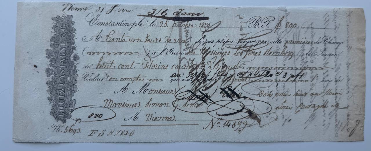 Bill of exchange issued by Louis Castagne & Co., Constantinople, payable to Simon J. Sina in Vienna. Features elegant engraving and complex merchant calligraphy. Theme: Ottoman Merchant Banking, Austro-Ottoman Finance.