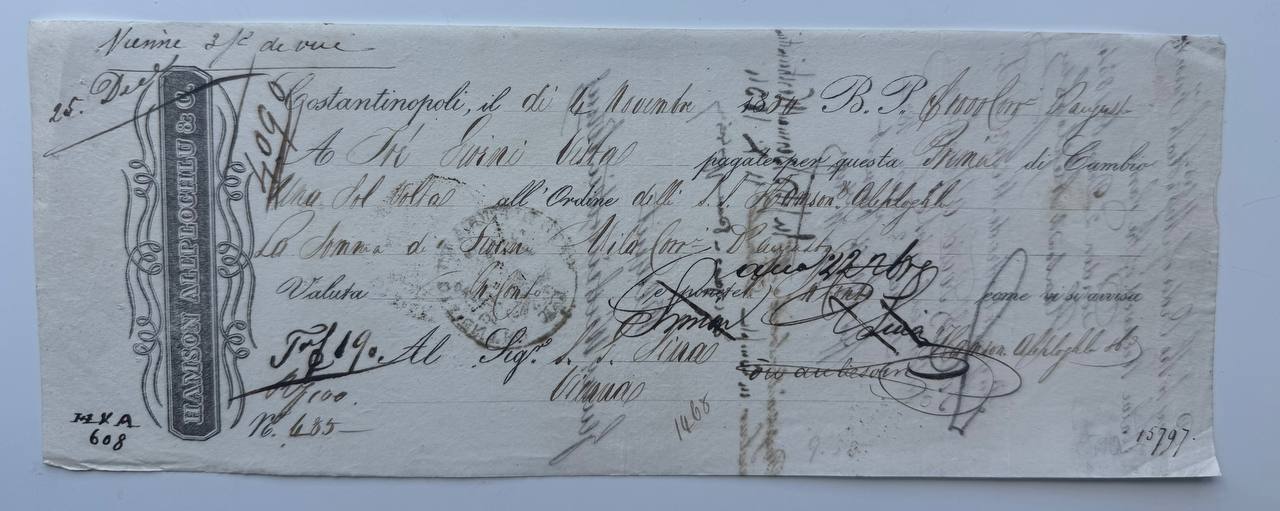 Large merchant bill drawn by Hamson Aleppoglou & Co. in Constantinople. Dated 1854, payable in Vienna. Finely executed design. Theme: Levantine Trade, Constantinople-Vienna Corridor.